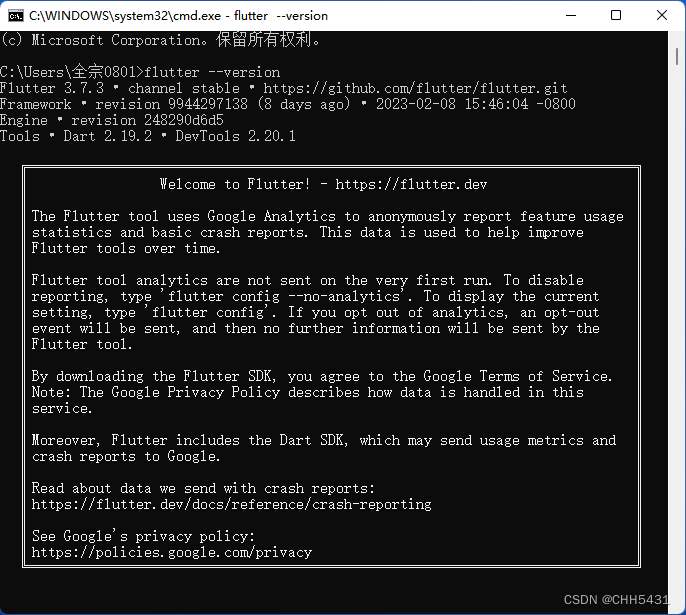 5. 输入 flutter --version 指令检查是否配置成功,如下界面表示配置成功: