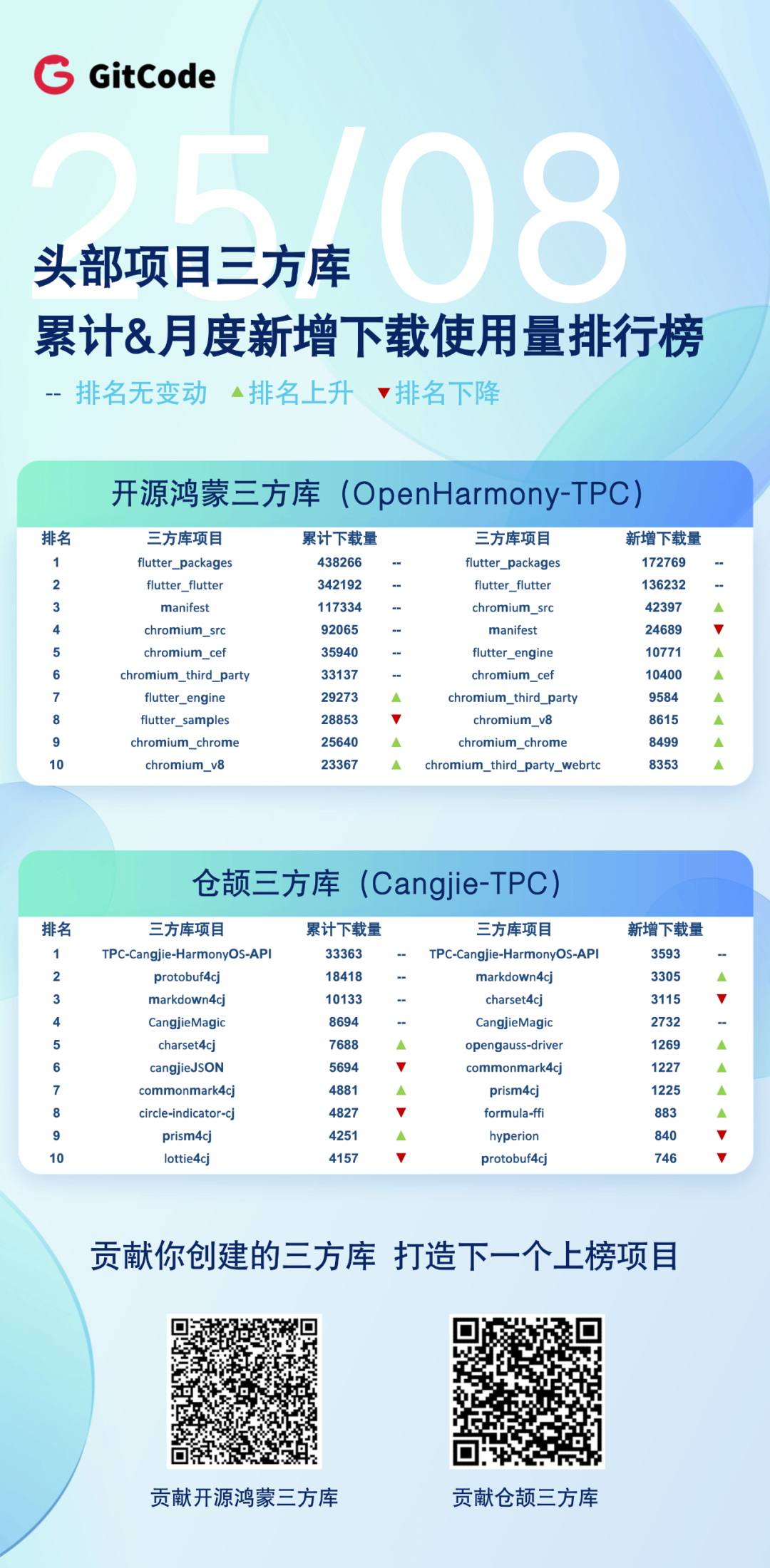GitCode 公开三方库下载使用量8月榜单正式发布!本榜单统计了累计下载量和月度新增下载量双重维度,展现各大头部开源项目三方库的社区使用情况与增长潜力。 开源鸿蒙三方库(OpenHarmony-TPC)与仓颉三方库(Cangjie-TPC)两大生态持续活跃,众多优秀项目表现亮眼✨