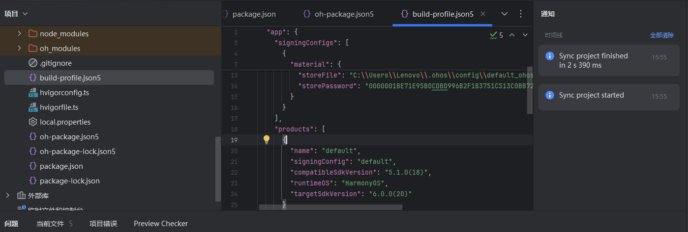 然后打开build-profile.json5添加自己想要编译到的设备的sdk版本(targetSdkVersion)