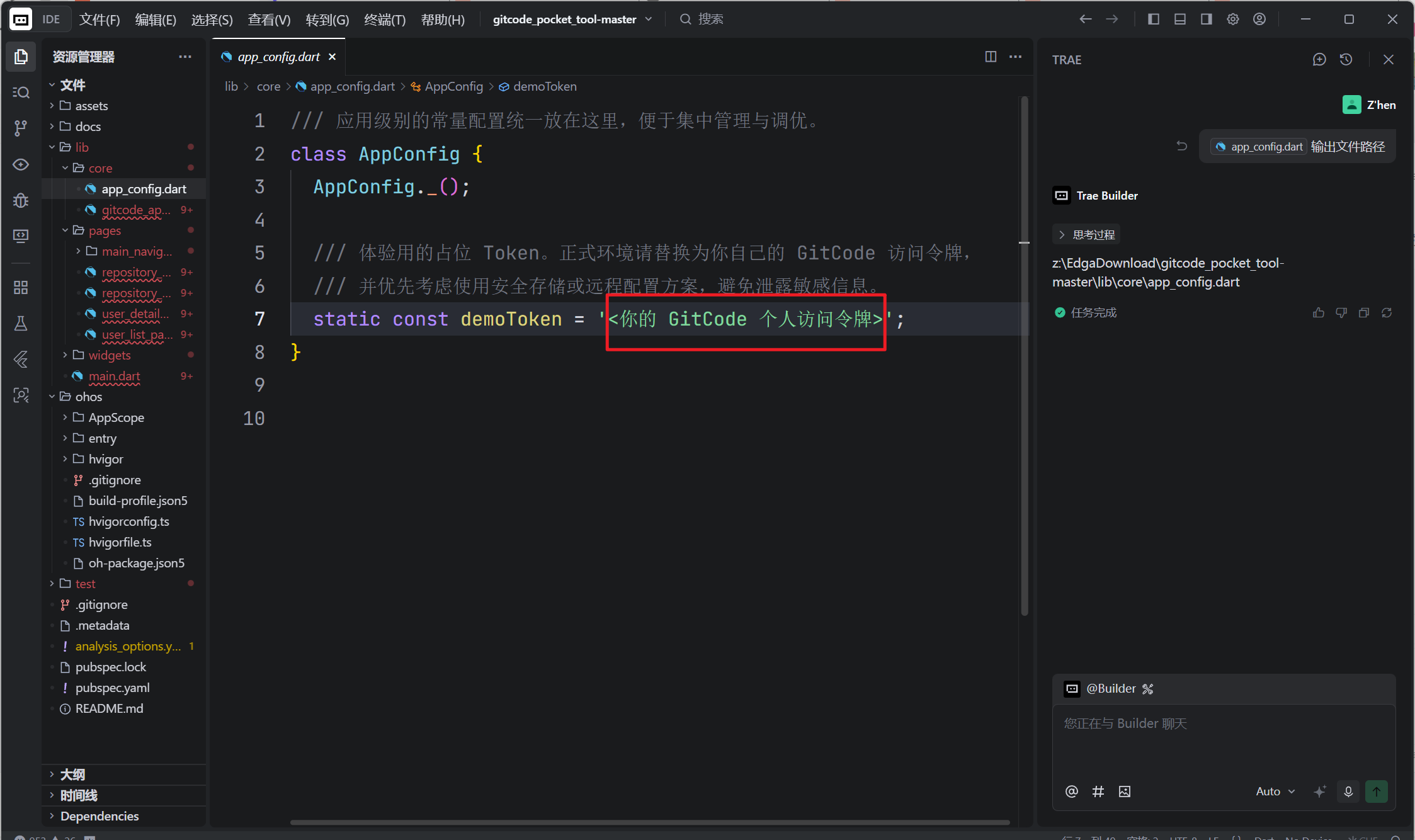 获取访问令牌的过程在引言的介绍文章中5.3部分介绍,下载并解压文件之后,使用 Trae 打开文件。