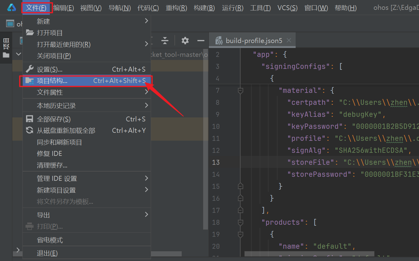 然后点击文件 --> 项目结构 --> Signing Cofigs