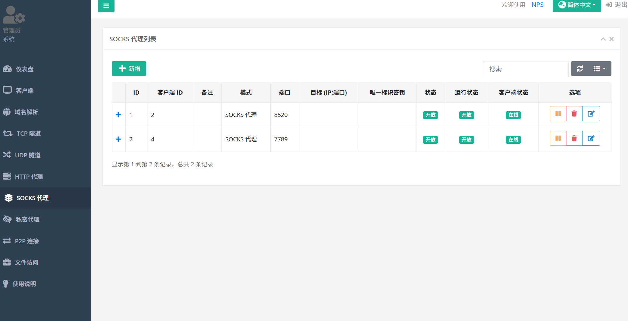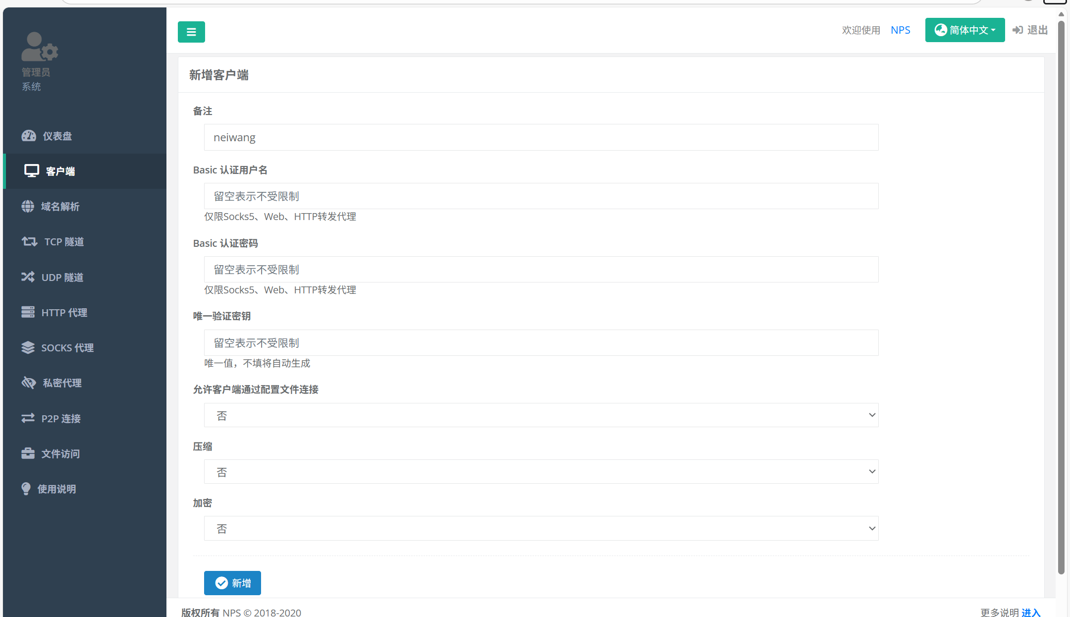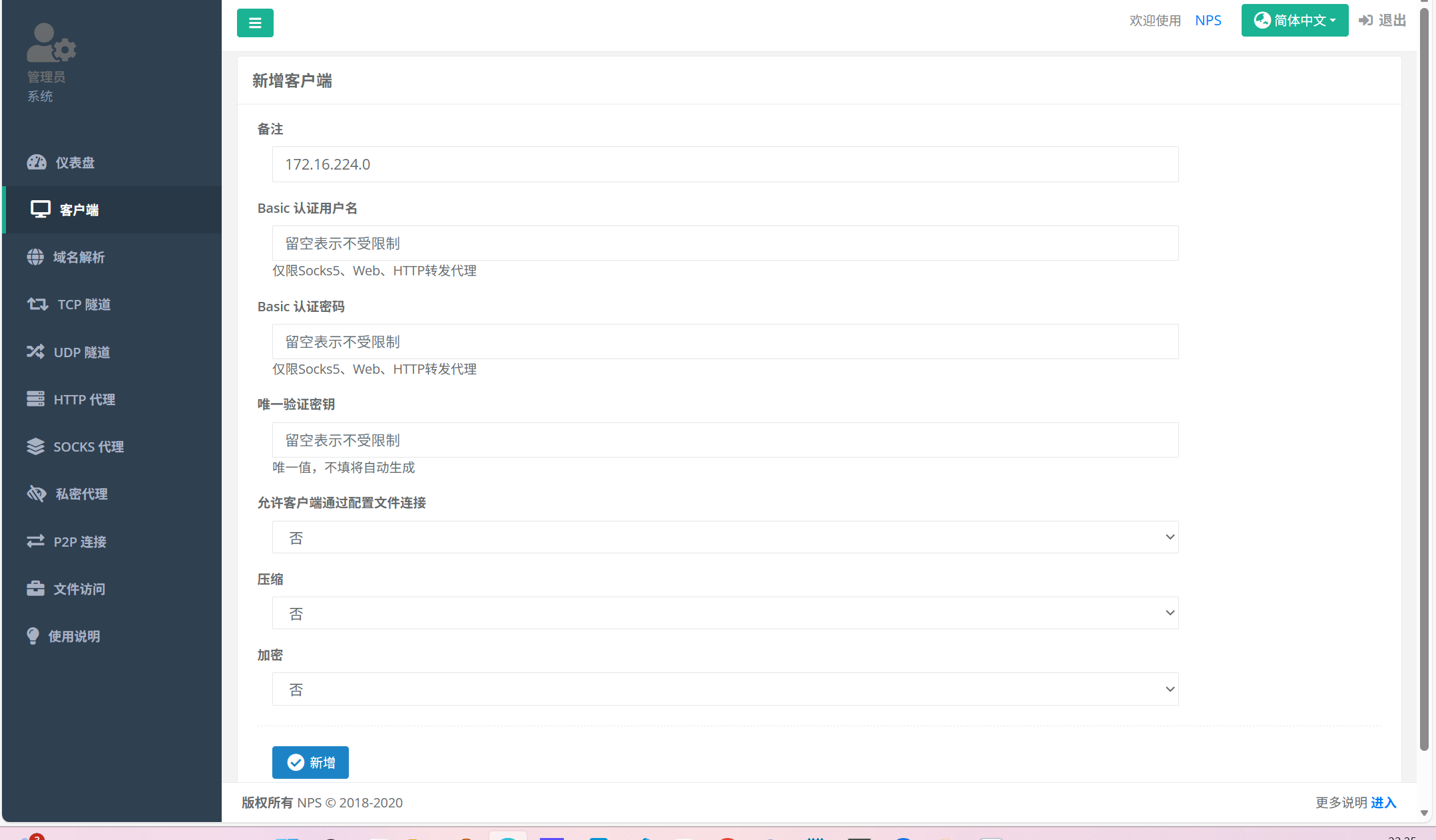 使用nps来搭建代理,代理需要在公网服务器上做nps服务端,然后npc在我们的靶机上执行