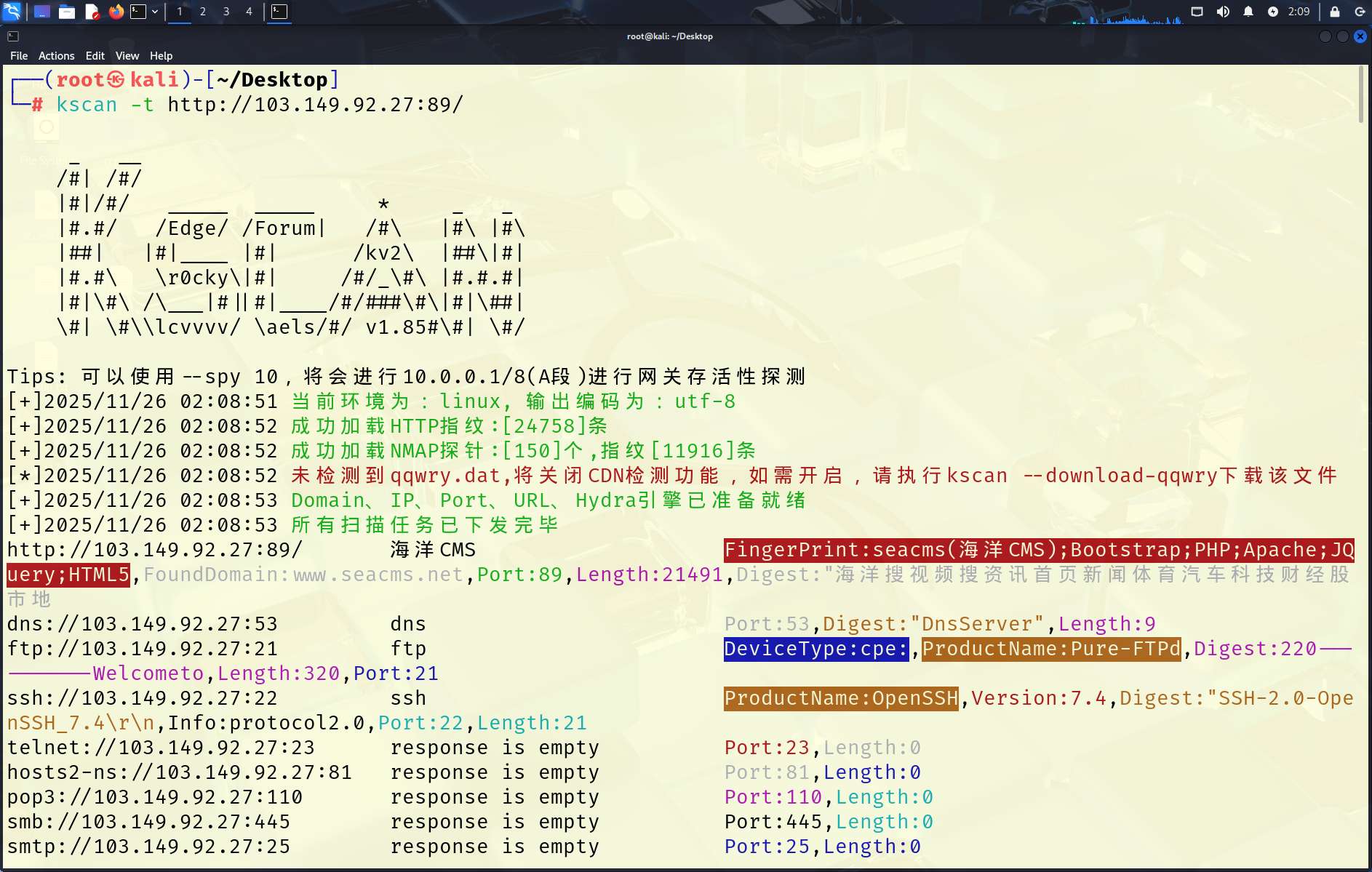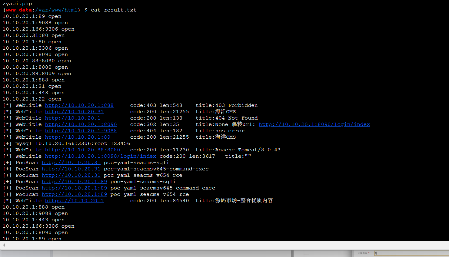 | 10.10.20.1 | 89 | 海洋CMS | 经典海洋CMS,前台SQL注入、任意文件读取、getshell漏洞多 |