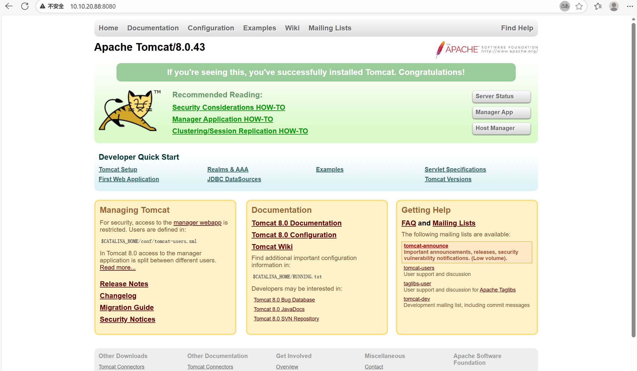 | 10.10.20.88 | 8080 | Apache Tomcat 8.0.43 | 老版本 Tomcat,弱口令经理登录或直接 war 部署 getshell |