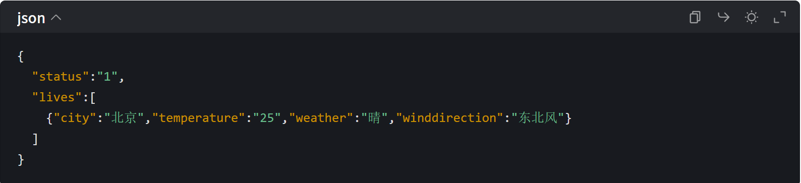 本文使用 “高德开放平台天气 API”(需自行注册获取 Key),接口返回格式如下(简化版):