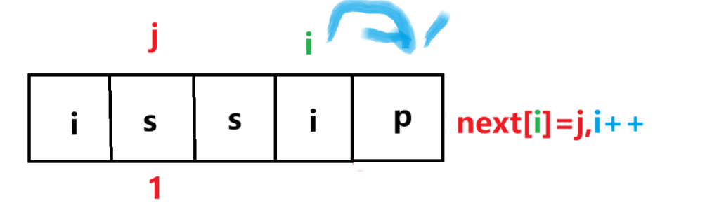 用j代表前缀的末尾,i代表后缀的末尾,当i等于0的时候,没有前后缀,默认为0,并且用for循环遍历i指针,除此之外,j还充当i当前位置的最长相等前后缀长度这一角色!因为只needle[i]==needle[j]的时候,j才会后移,j的值也才会+1,