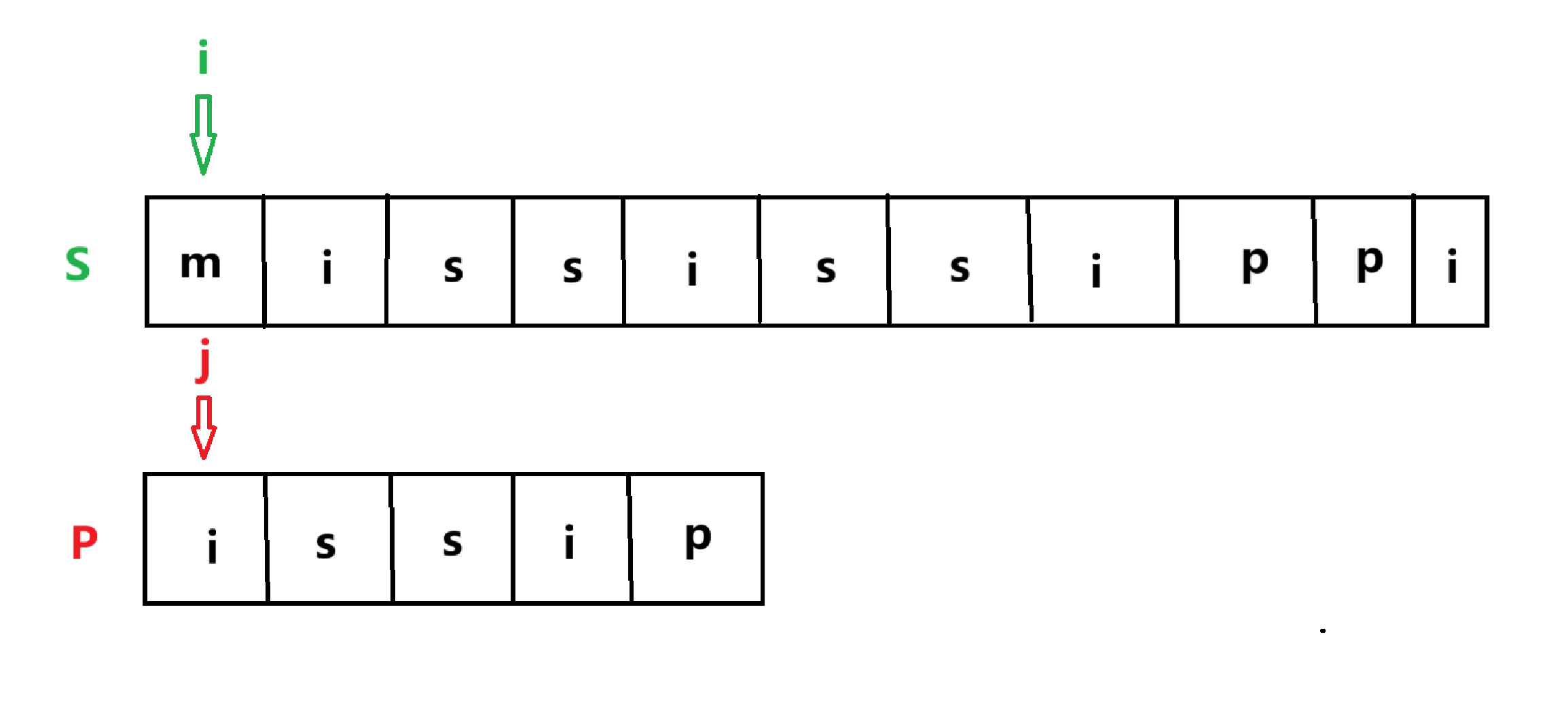假设这里有一个主串S,模式串P,指针i指向S的第一个字符,j指向p的第一个字符