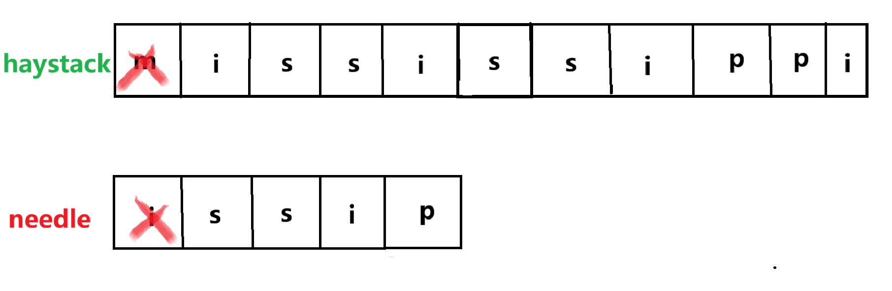 题目要求我们在haystack数组中找到与needle相匹配的子串的第一个匹配字符串,那我们只需要先找到相匹配子串,然后返回该子串的第一个字符的索引下标就可以了!