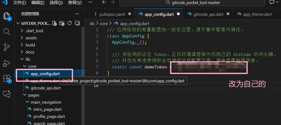 core目录存放全局配置(AppConfig)和 API 封装(GitCodeApiClient),main.dart实现 UI 交互。