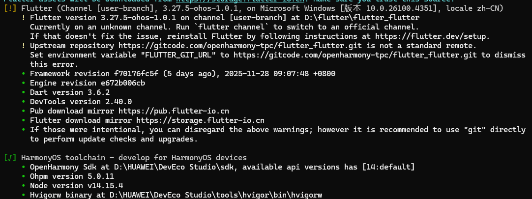 因为之前已经下载了dev(5.0.X),配置全部完成了。但是在使用命令flutter create --platforms ohos flutter_harmonyos创建项目时,一直报错。询问ai之后发现是api版本太高(默认14),需要10或9进行下载。但是下载api10之后,无论重启还是重新配置都没有办法解决。可能是因为dev和flutter的版本不一致导致的。所以干脆直接把原有的dev删除,下载最新版本的。重头进行配置。建议还是跟教程保持一致,原先有的全部删掉。