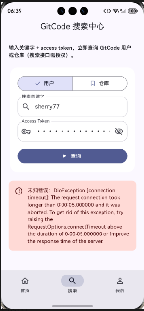 - 基础配置:基于 Dio 封装 GitCode REST v5 API,统一设置 5 秒超时时间,请求头附加