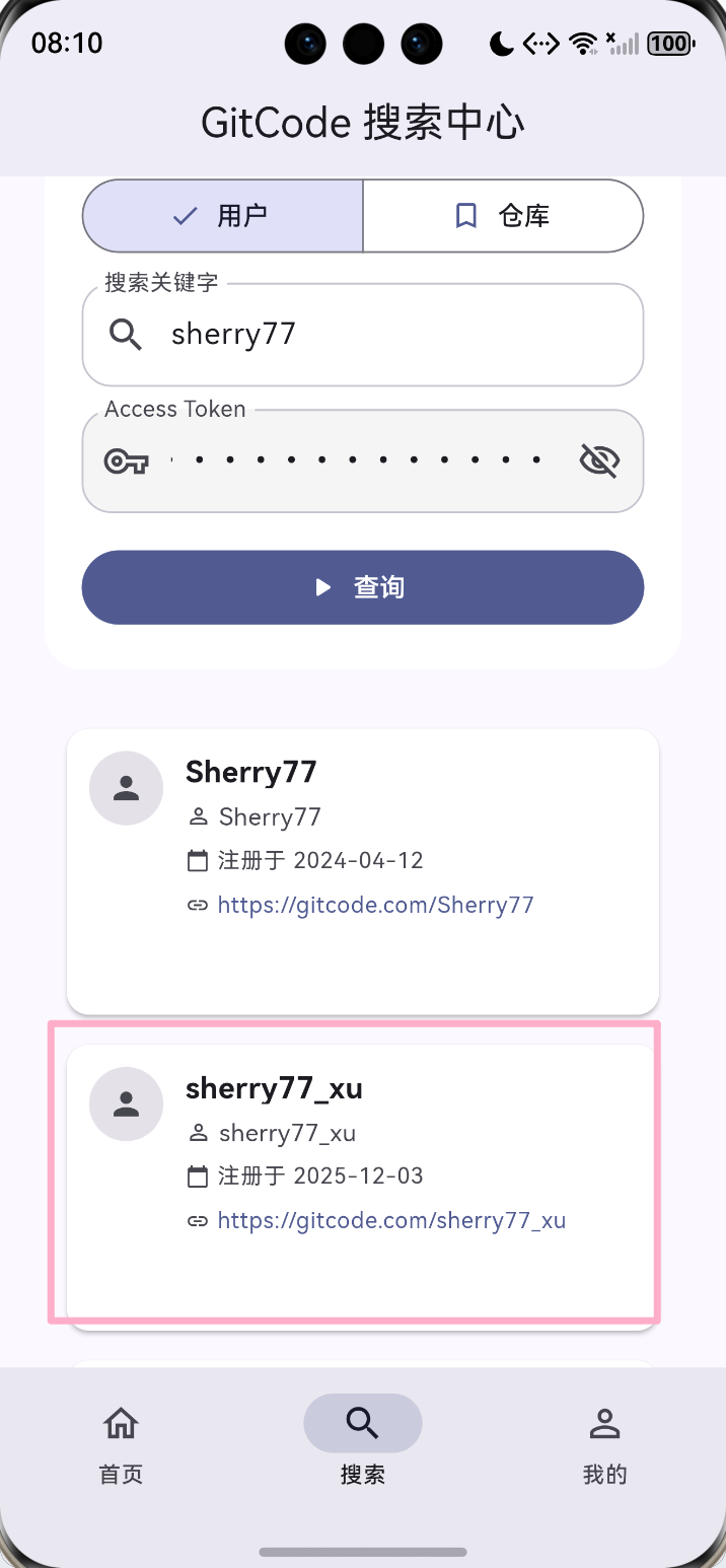 fetchUser:通过用户名查询用户详情,404 时支持基于 token 的昵称→login 降级搜索。searchUsers/searchRepositories:支持分页的用户 / 仓库搜索,校验参数范围(perPage 1-50、page 1-100),统一抛出GitCodeApiException友好错误。