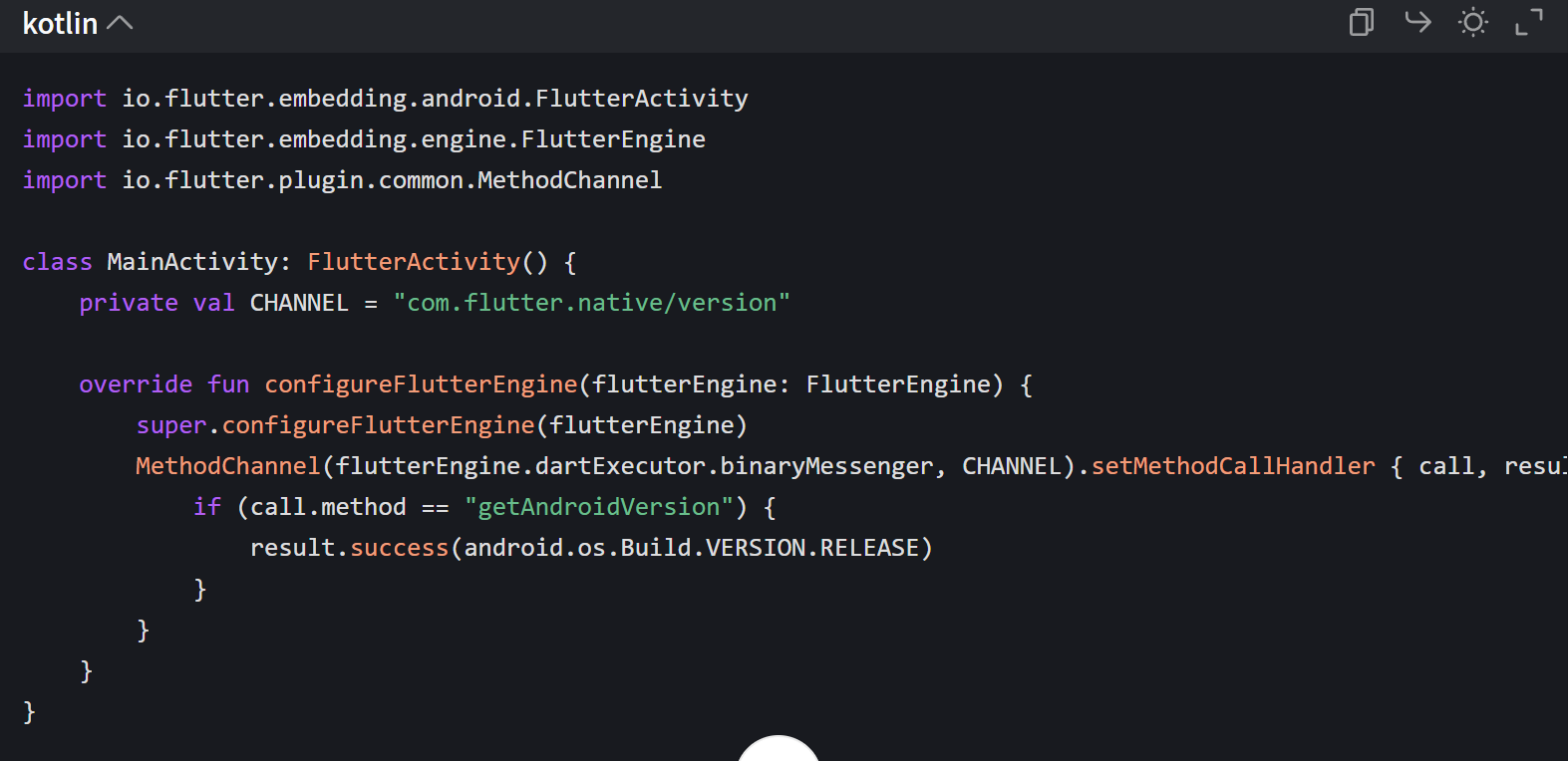 代码说明:通过 MethodChannel 实现 Flutter 调用 Android 原生 API 获取系统版本号,代码精简且通信逻辑完整。