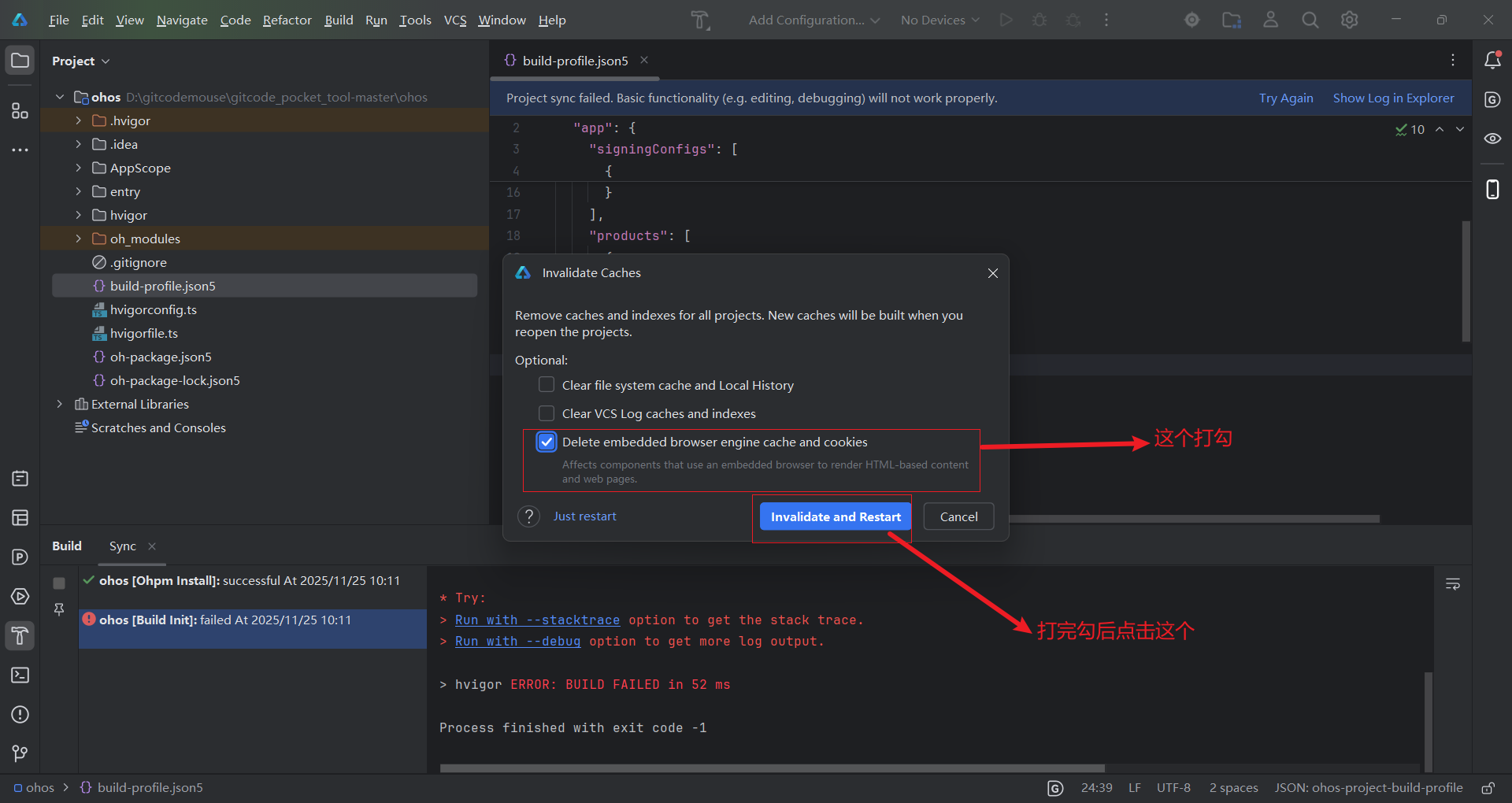 由于我们使用的是别人的项目,所以需要先删除项目原有的调试签名,然后点击【清理缓存】