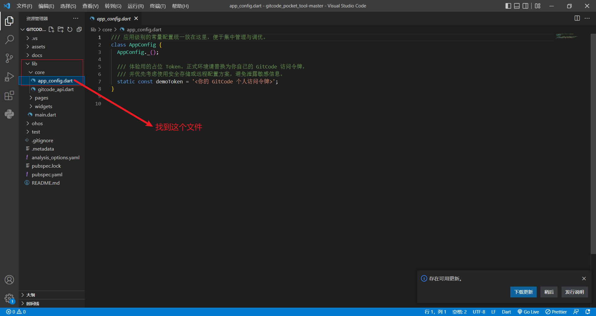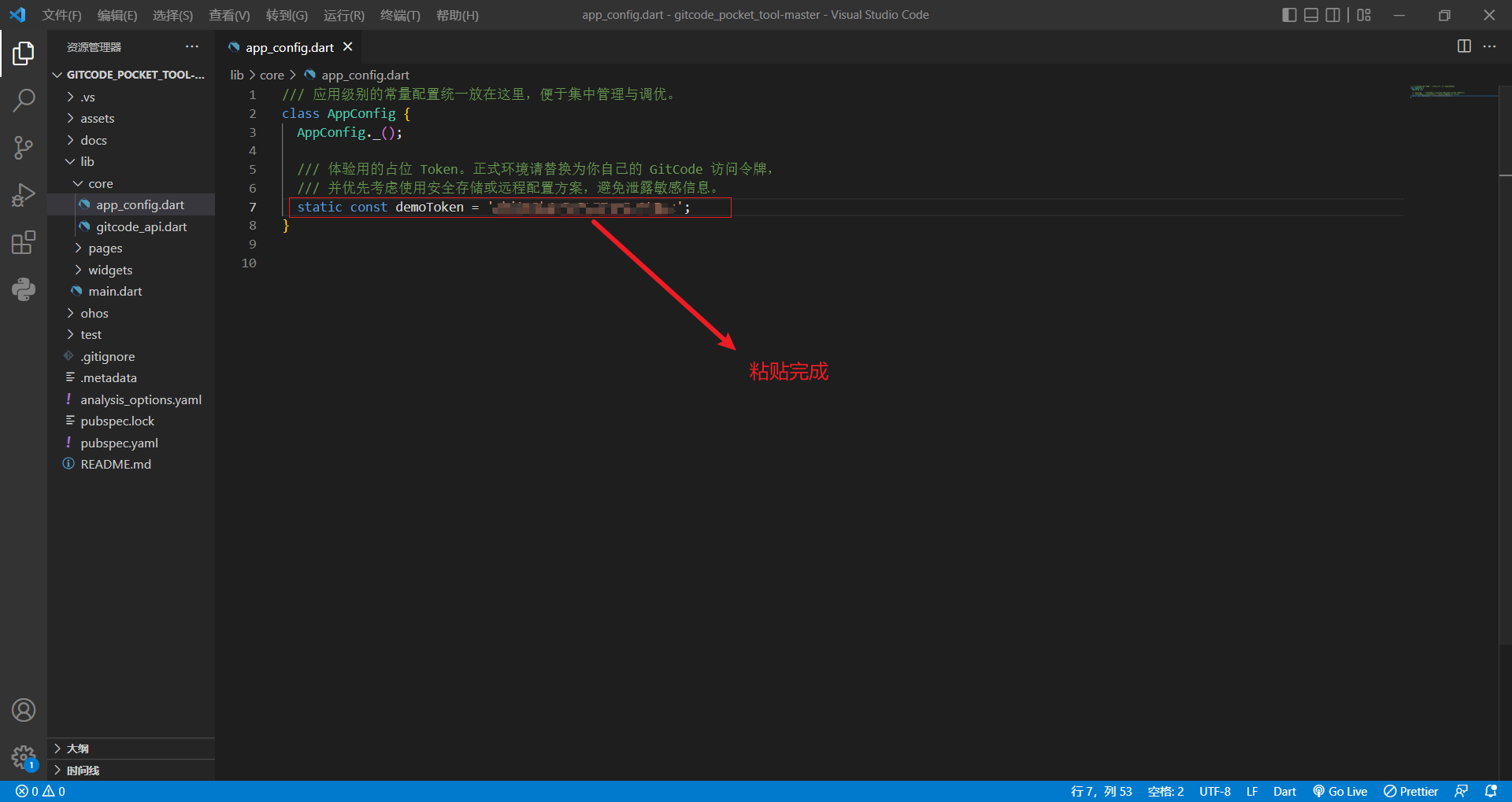 将刚刚下载好的项目源码解压,然后在VSCode等软件中打开。找到并编辑配置文件:lib/core/app_config.dart,在相应位置填上自己的个人访问令牌。此处我是用vscode打开