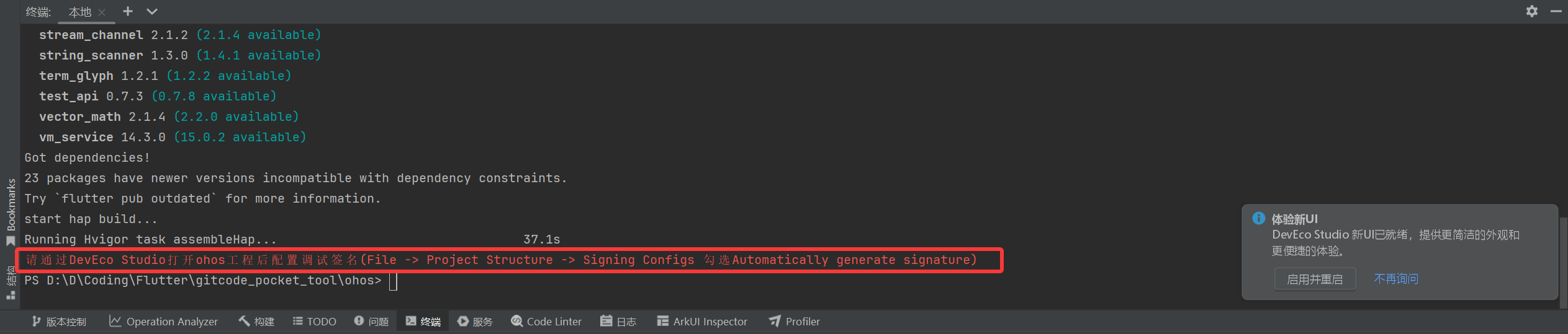 打开终端,执行flutter build hap命令构建项目。