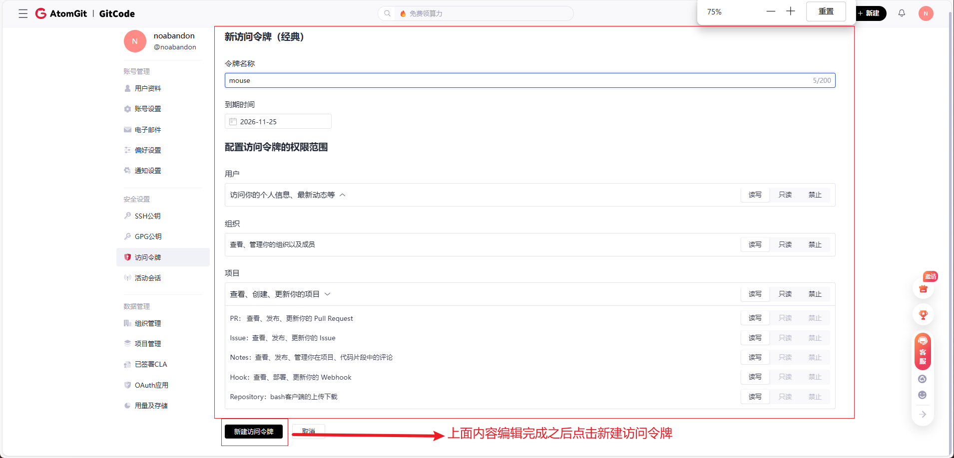 在打开的界面中,配置好令牌名称及到期时间,然后点击页面下方的新建访问令牌,即可完成新建。