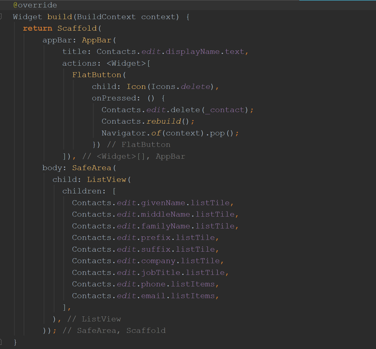 例如,您可以看到下面的AppBar.title属性正在从Contact的displayName引用中获取其数据。 您知道AppBar的title属性接受一个Widget,因此您可以正确地猜测'Contacts.edit.displayName.text'项目将返回一个Text Widget。 清洁。