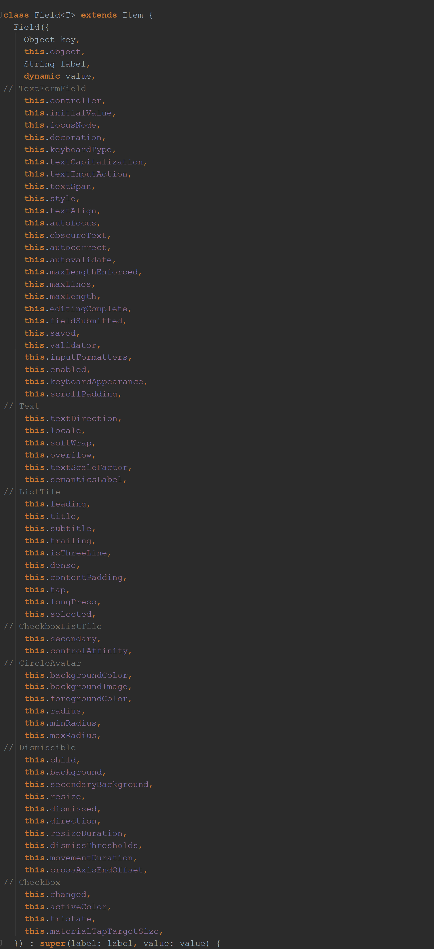 因此,让我们进一步看一下Field这个类。 您可能已经猜到了。 我创建的这个库使我作为开发人员的生活变得更加轻松。 它使我的代码( build()函数中的代码)更加整洁。 当Controller要提供特定的数据字段时,它可以使用最适合这种情况的Widget来提供。 它可以是TextFormField,Text,ListTile,CheckBox等。 小部件的列表是有限的,但是正在不断增长。 像任何好的库文件一样,它为您完成了很多繁琐的工作。