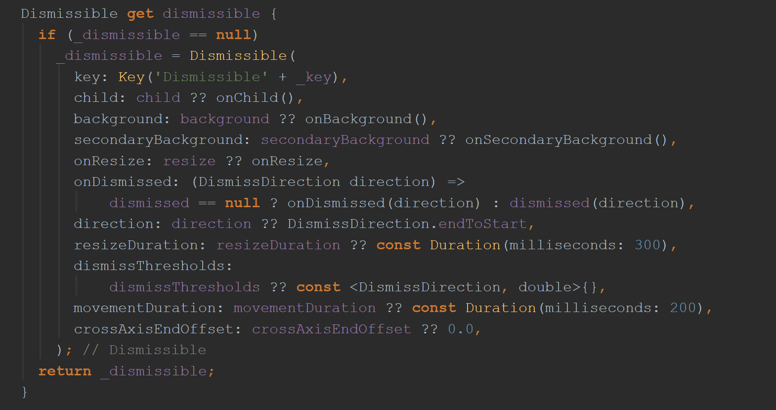 正如您在上面看到的,有很多事情要做。 库的设计旨在使开发人员的生活变得更加轻松,但是结果是,它们自身会变得混乱(在后台发生了很多事情。)在这种情况下,与Widget相关的所有参数Dissimissible都是供用户使用...或不提供。 如果不是,则库提供其他值或函数。 这样做允许选择,并且开发人员喜欢选择。