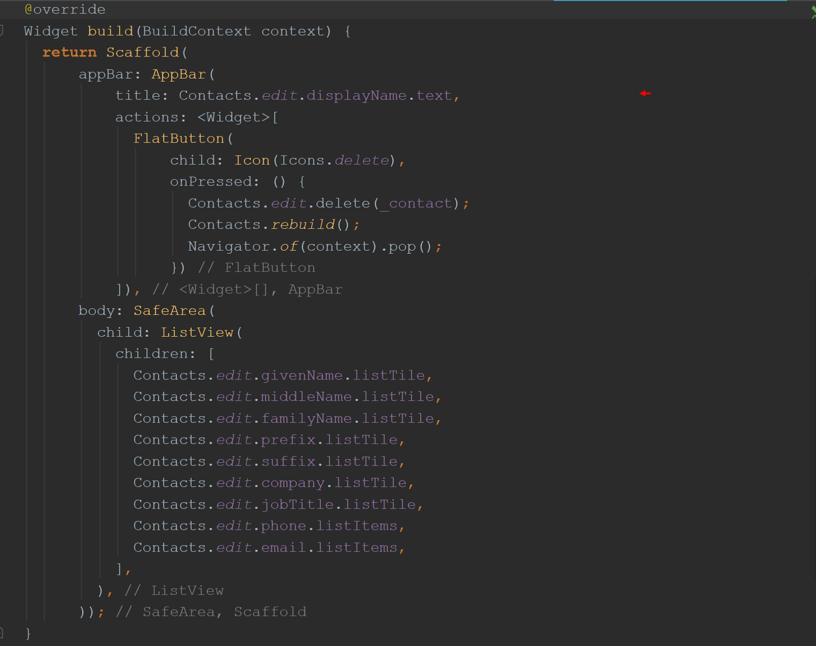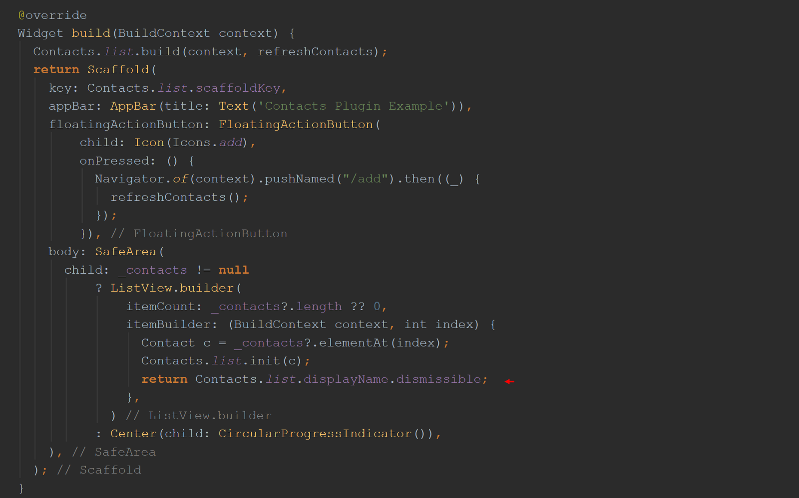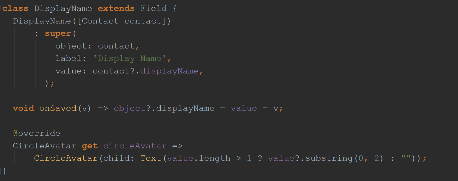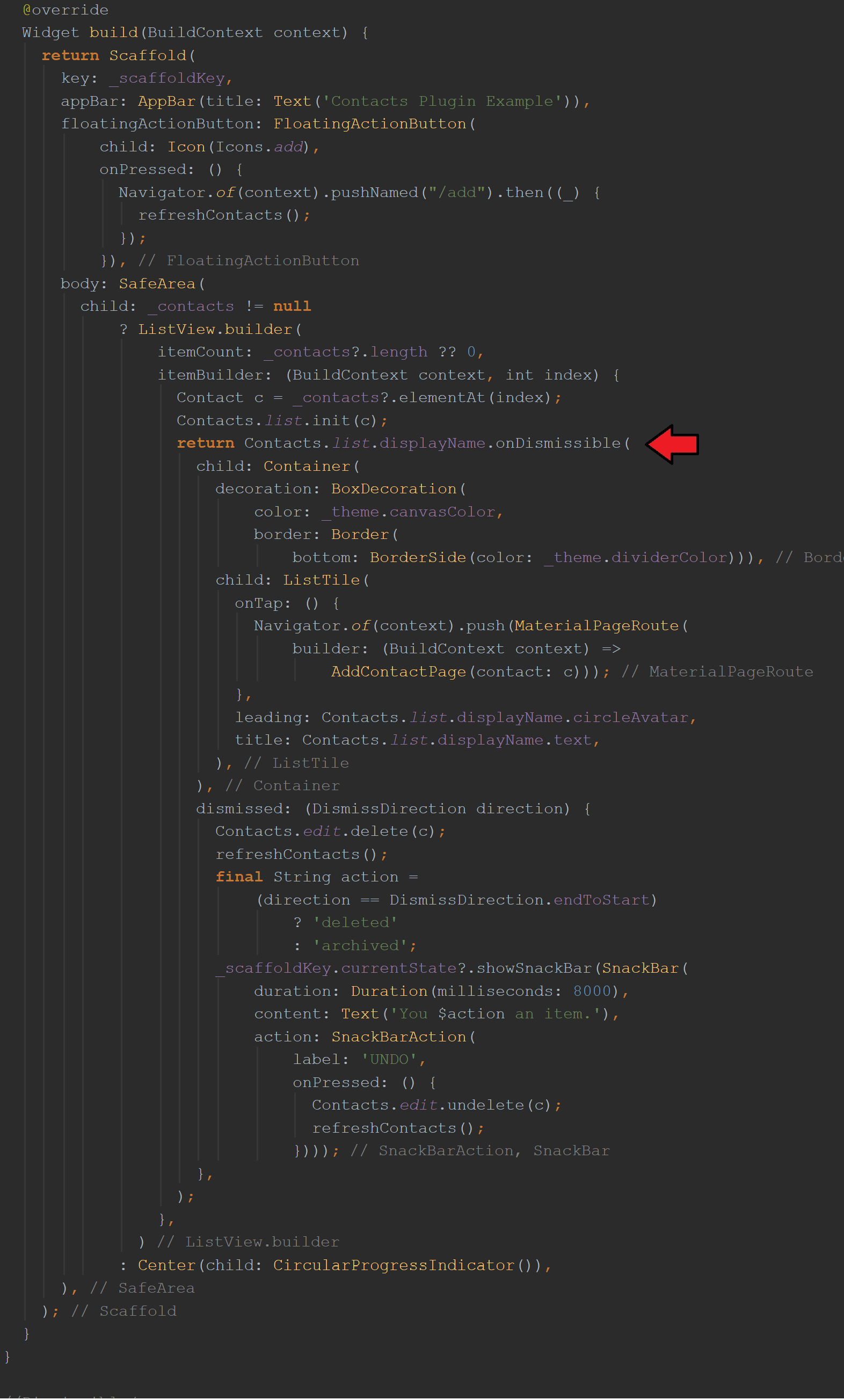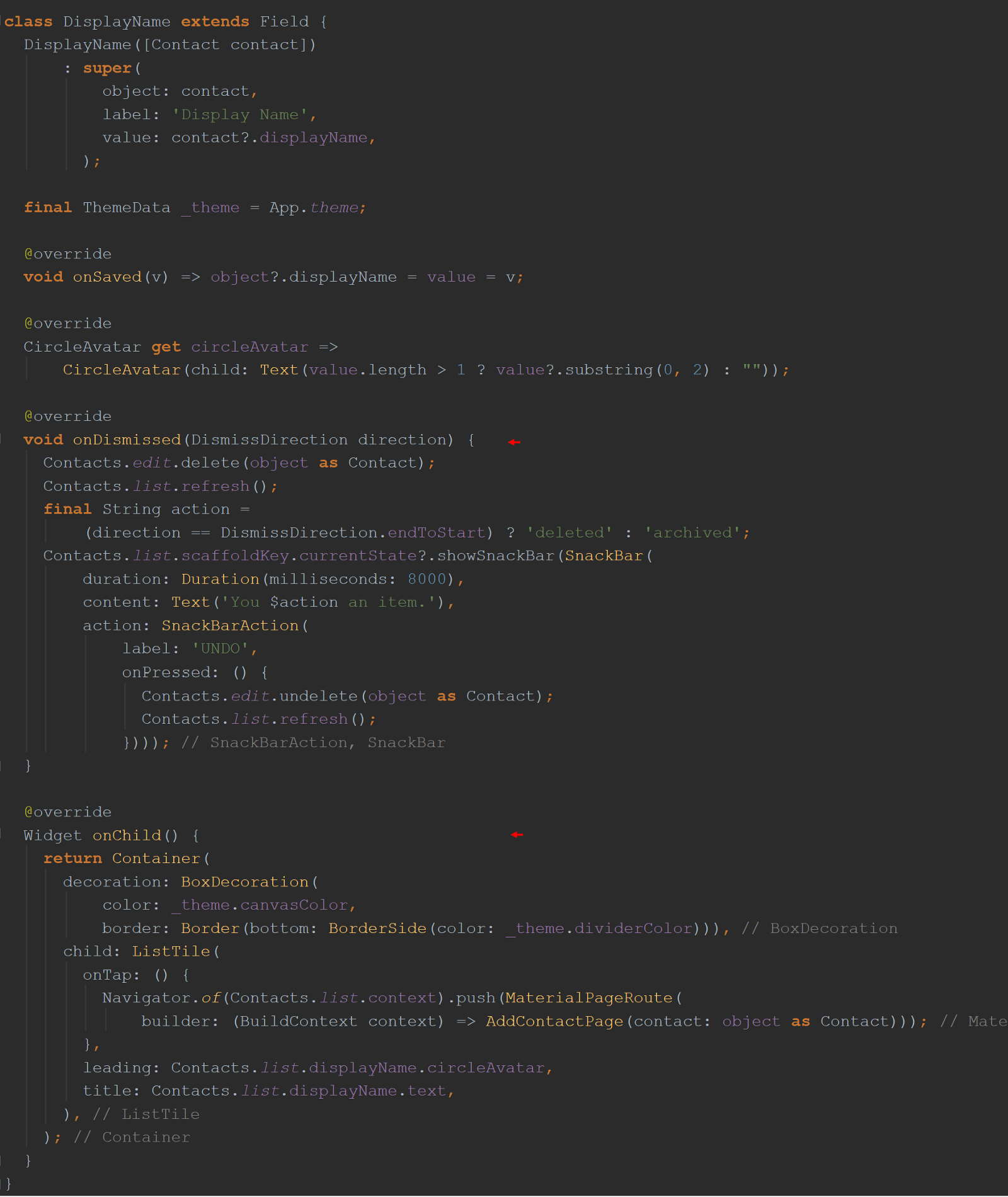 上图是与onDismissible方法首先显示的相同build()函数。 它与它的命名参数一起使用:child和dismissed,但是现在它们都消失了! 现在替换为“ Contacts.list.displayName.dissmissible”项。 他们去哪了 猜一下。 如果您猜想它们现在在类DisplayName中 ,可以通过getter displayName访问,那将是正确的。