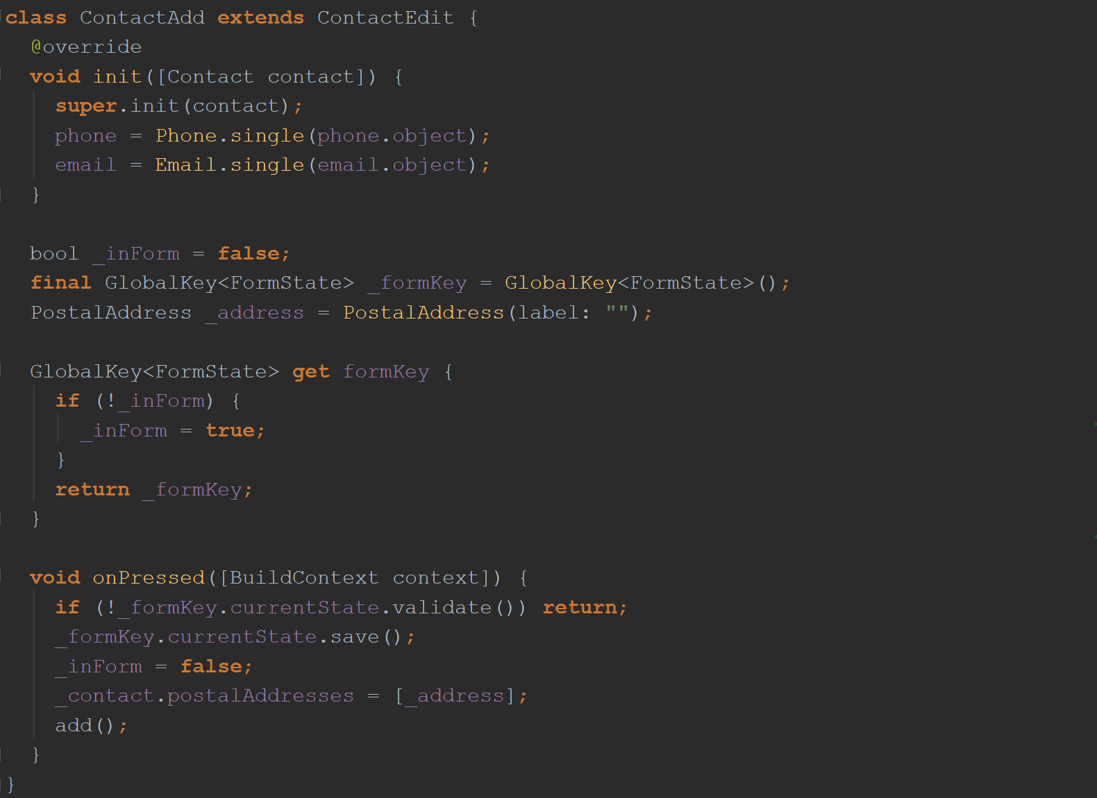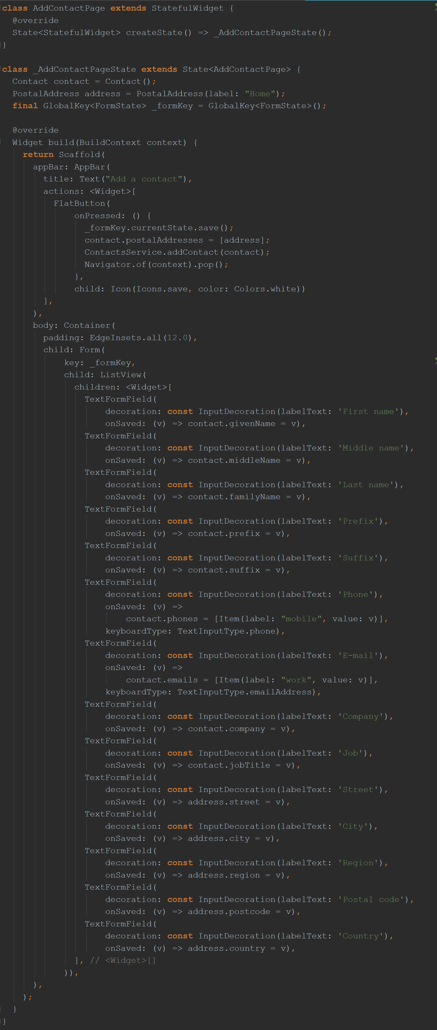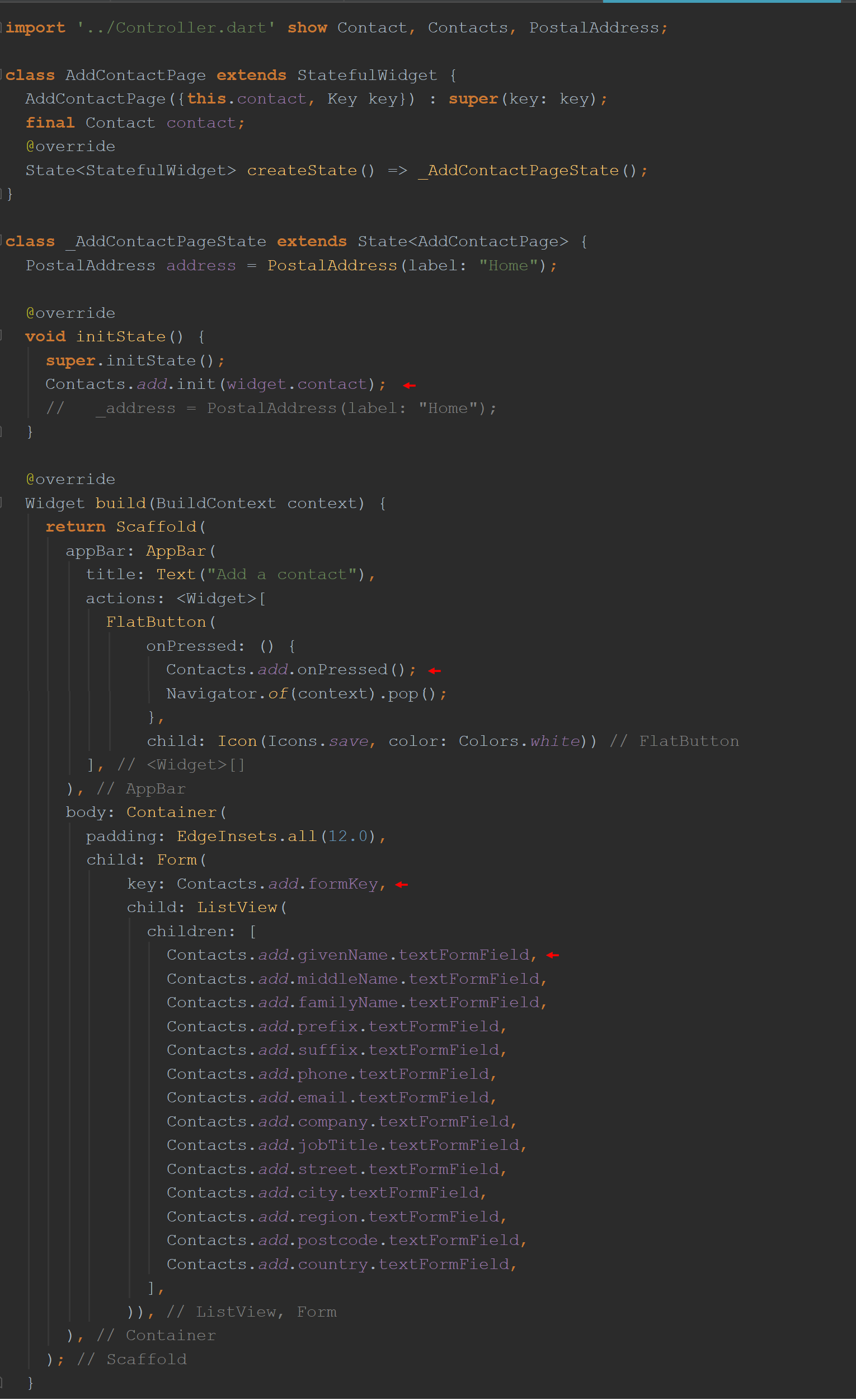 调用FlatButton小部件的onPressed方法时(当用户按下屏幕的“保存”按钮时),您要调用哪种方法? 再次回顾一下ContactAdd类 ,我想说的是您将调用其自己的“ onPressed”方法。 这种方法具有“更大的目的”。 您可以看到build()函数实际上指示了控制器要使用的api,不是吗?