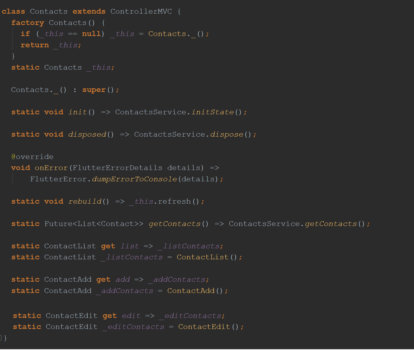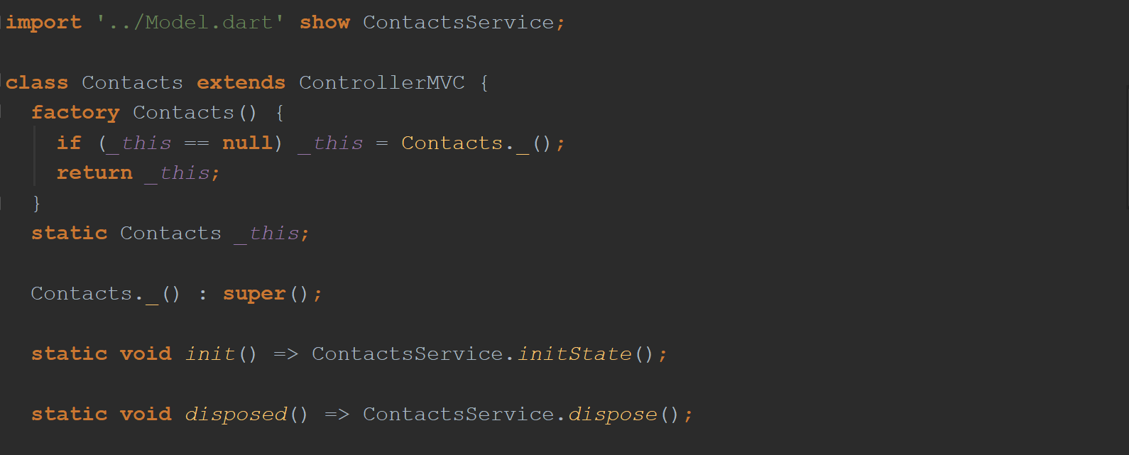 如果您熟悉我在Flutter中的MVC实现,您将认识到Contacts类是MVC设计中的Controller,因为它扩展了ControllerMVC类。 您还可以看到它实现了一个静态工厂:Joshua Bloch现在著名的2001年原始出版物有效的Java中的第1项。 您会看到它导入了类ContactsService-该应用程序的Model部分。