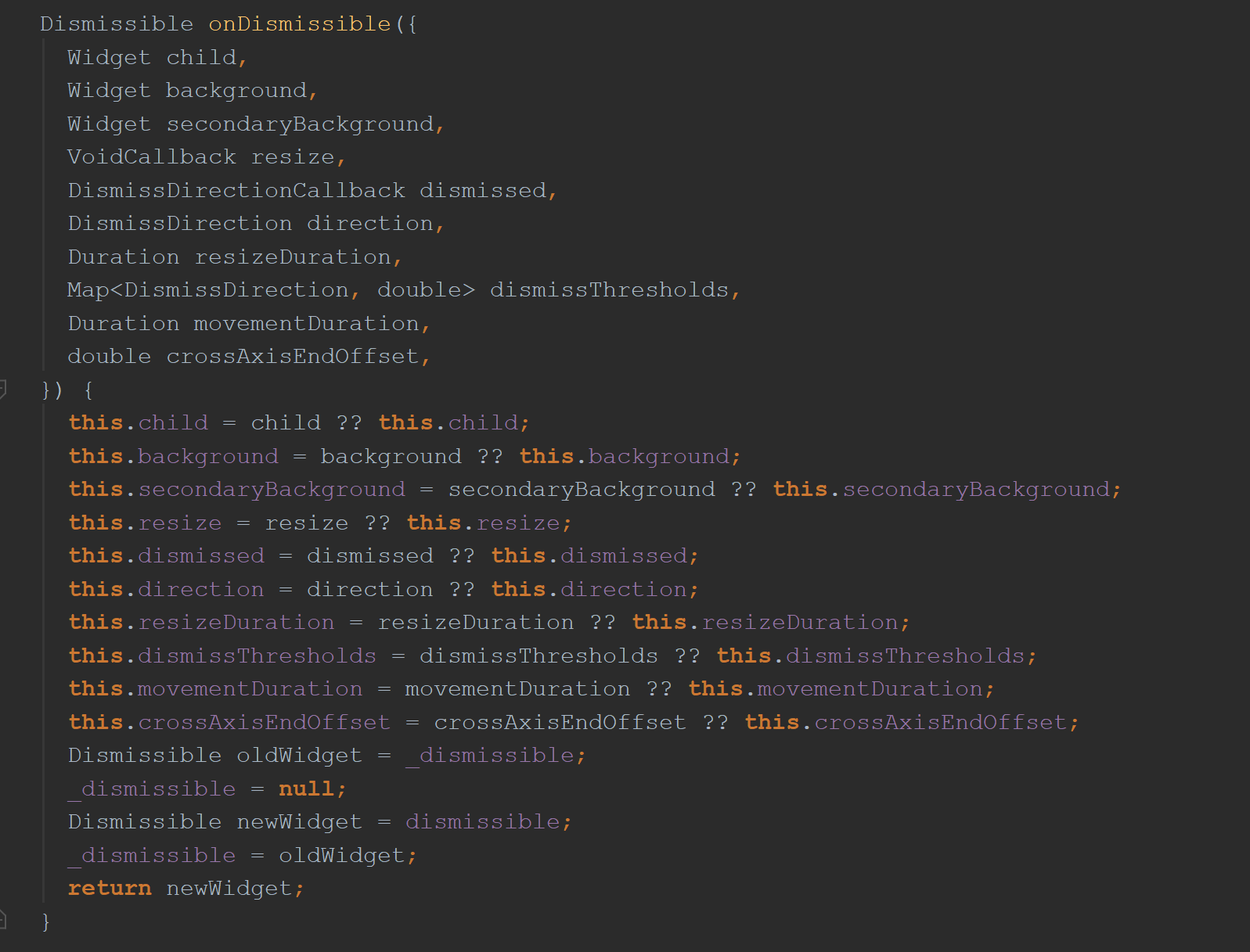 上面的方法实际上称为getter ,可忽略。 吸气剂将所需的小部件(在本例中为Dismissible)返回到上面列出的变量newWidget。