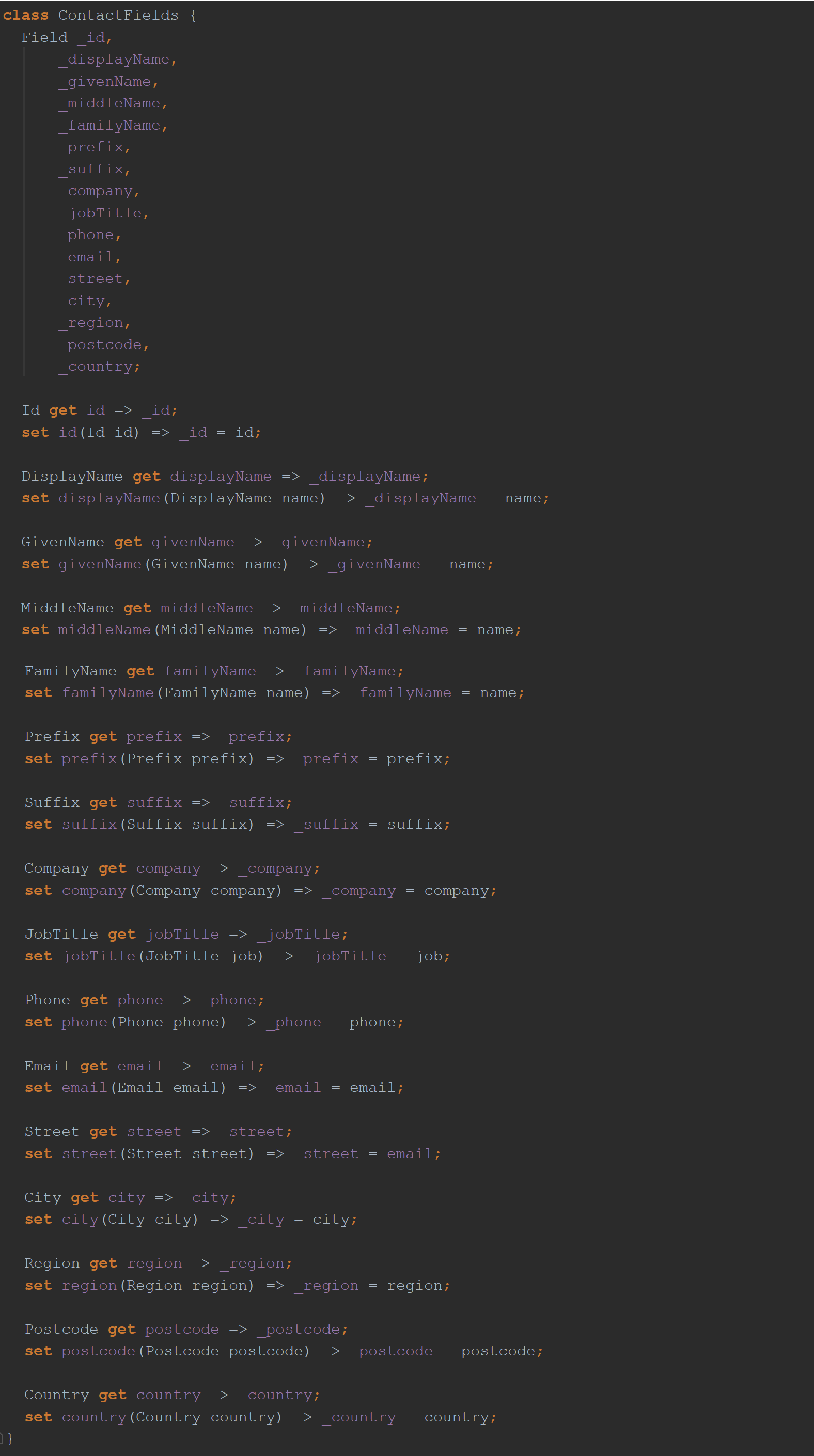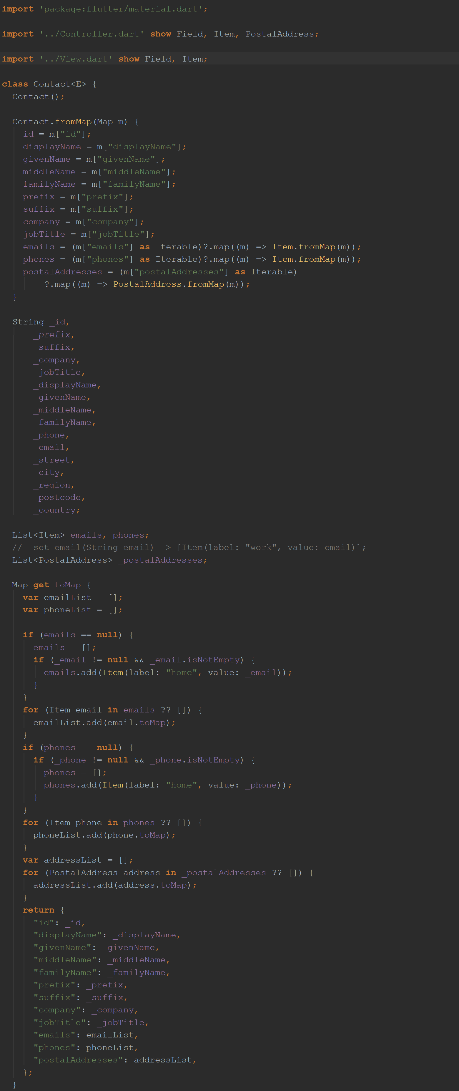 Contact类具有getter toMap 。 如下所示,它还有一个名为Contact.fromMap的命名构造函数。 您可以猜测会发生什么。 您在这里看不到它们,但是该构造函数将地图条目分配给以联系人的字段名称命名的二传手列表。 但是,您确实看到了由这些设置员分配的“库私有”变量的列表。 最后,您将看到getter toMap,它将联系人的属性转换回Map。 您会正确猜到“后端”直接处理Map对象。 清洁。