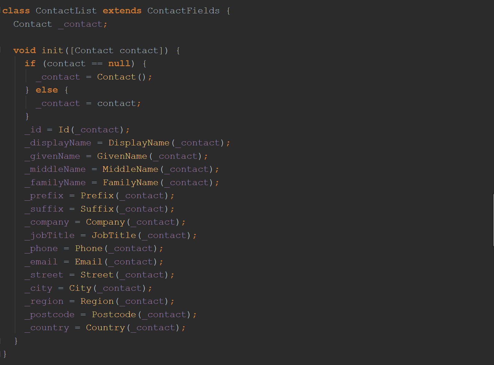 下一个类是前两个的父类。 它具有一个称为init()的单独方法。 您会看到混乱的“图书馆私有”变量被分配了各种“字段”类。 所有这些变量显然都是从父类ContactFields定义的。 如果没有Contact对象传递给init()方法,则会创建一个“新” Contact对象。 注意,对象已分配给该变量_contact,我们在上一类ContactEdit中看到过。
