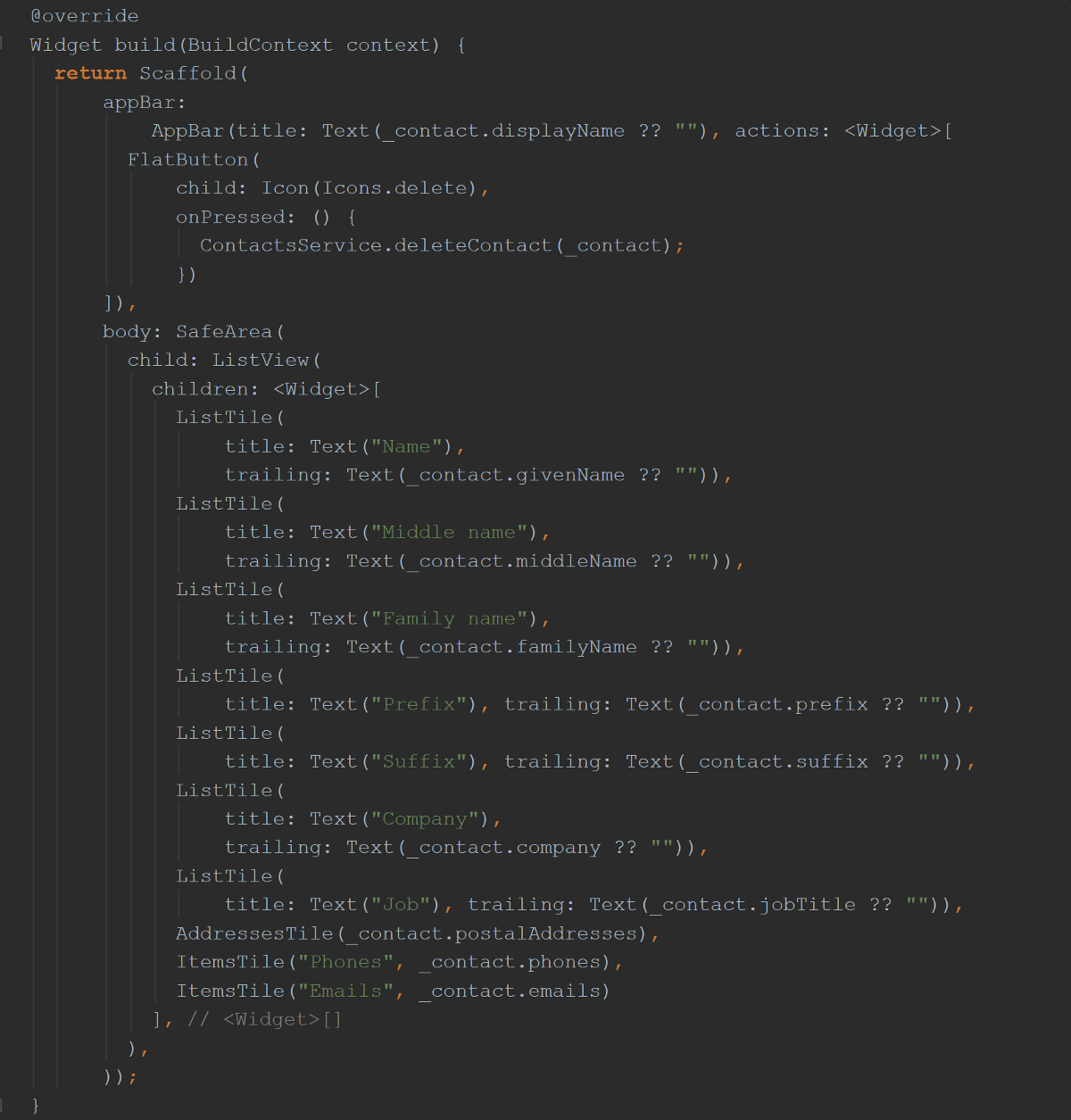 我会保留其原始版本,但是您会迷失在代码中。 如果要进行比较,请查看其原始的Github 。 请注意,我确实在我的版本中放入了Dissmissible小部件(红色箭头),以便轻松删除联系人。 原始版本没有删除联系人的方法,在我的版本中,您可以一目了然地看到显示了哪些字段并通过滑动将其“删除”了!