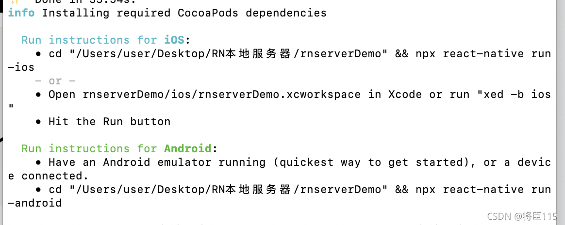 1、首先我们创建一个RN项目,在终端cd到一个文件夹,然后执行react-native init rnserverDemo --version 0.61.0 我们就创建这个0.61.0这个版本的项目来执行