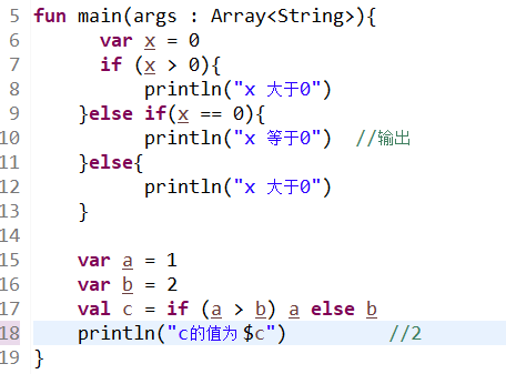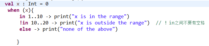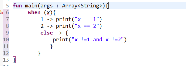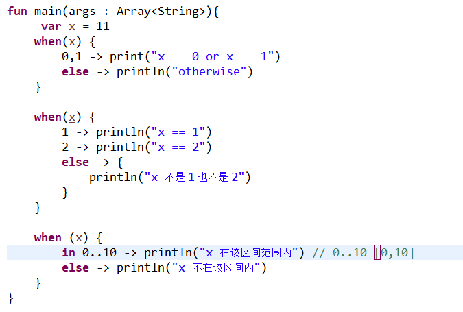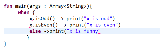 when也可以用来取代if-else if链,如果不提供参数,所有的分支条件都是简单的布尔表达式。而当一个分支的条件为真时则执行该分支: