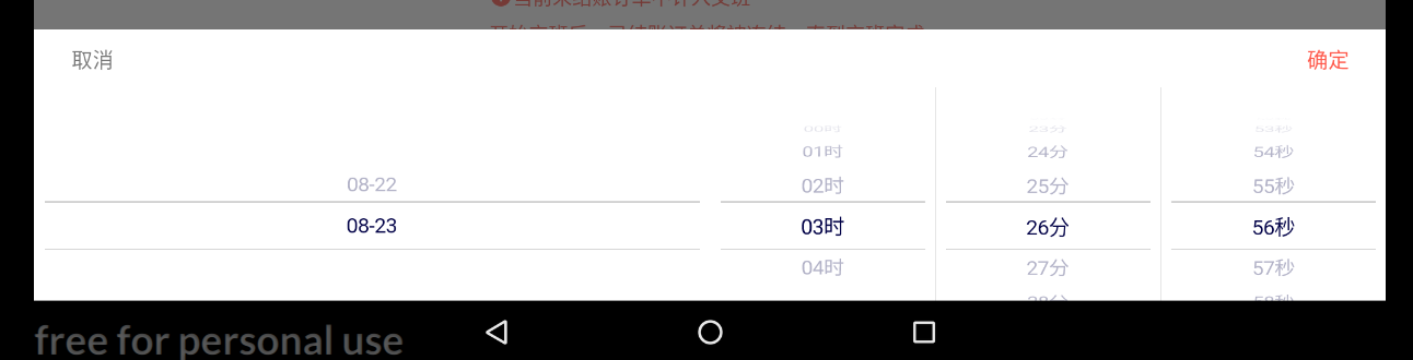 import 'package:flutter_cupertino_date_picker/flutter_cupertino_date_picker.dart' as HandOverDutyDatePicker; HandOverDutyDatePicker.DatePicker.showDatePicker(context, minDateTime:DateTime.now().add(Duration(hours: -24*1)),//最小值 maxDateTime:DateTime.now(),//最大值 initialDateTime:DateTime.now(),//默认日期 // dateFormat:'MM'+'月'+' '+'dd'+'日'+' '+'HH时'+'mm分',//显示时间格式 dateFormat:'MM-dd HH时:mm分:ss秒', locale:DateTimePickerLocale.zh_cn, pickerMode:DateTimePickerMode.datetime,//选择器种类 onCancel:(){}, onClose:(){}, onChange:(data,i){print(data);}, onConfirm:(data,i){print(data);}, );