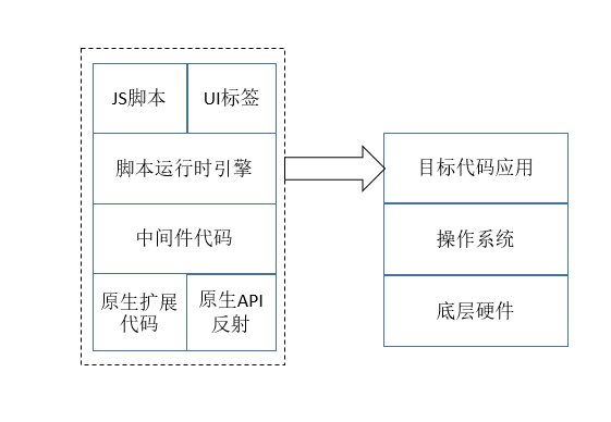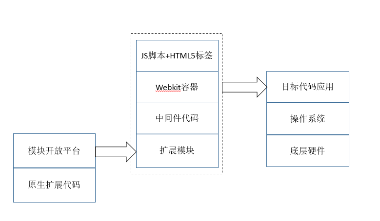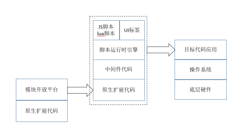 Facebook在React Native产品中所提出的 “Learning once, write anywhere” 本身也是一种复用的思想。大家厌烦了各种各样的编程语言,如果有一种语言真的能够统一移动开发领域,对于所有人都是好事。先不说这个框架后续是否能得到大众认可,单从源码来说,这个框架源码里有非常多的设计思想和实现方式值得学习。React Native产品虽然在实用性还有很大的不足,但它最大的价值则是为移动中间件技术提供了全新的发展思路。或许很多人还没有关注到,2015年中旬的时候一款DeviceOne的移动中间件产品正式对外发布,它对React Native产品架构进行全面的继承和改进,不仅实现了跨平台移动开发的“Write once, run anywhere”能力(同时支持IOS、Android、Windows10),还实现了原生开发扩展平台的完全开放。我们来研究一下这第二代移动中间件的改进模型吧: