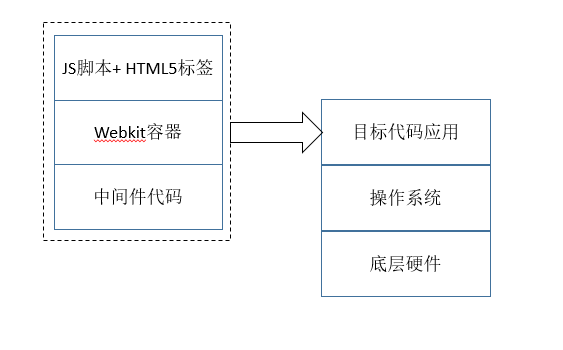 第一代移动中间件的编程(HTML5 Based App Programming)是基于HTML5技术的跨平台app开发模型。在这个模型中一般都通过内嵌的webkit内核来实现原生扩展代码的桥接,用HTML5构建网页UI,用网页中的Javascript编写业务代码。在这个模型下HTML5技术天生就具备跨平台的能力,而且很多传统的网站开发程序员在技术上也可以很自然的过度。采用第一代移动中间件模型的产品包括:PhoneGap平台、数字天堂中间件产品、烽火中间件产品等。我们可以通过下图来理解第一代移动中间件产品的模型: