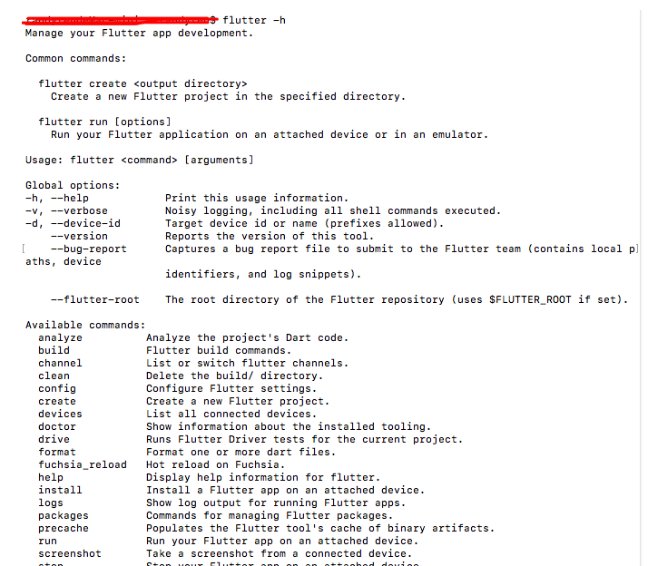 这个时候应该能运行flutter命令了,我们运行命令行: flutter -h