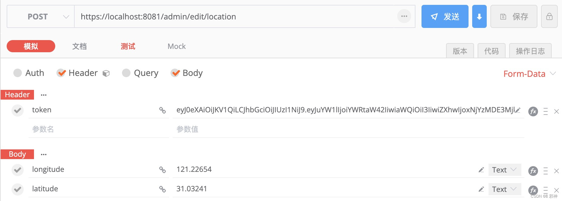 package com.xm.chat.controller.admin; import com.xm.chat.common.ServiceResultEnum; import com.xm.chat.entity.admin.Location; import com.xm.chat.service.admin.LocationService; import com.xm.chat.util.JwtUtils; import com.xm.chat.util.Result; import com.xm.chat.util.ResultGenerator; import org.springframework.stereotype.Controller; import org.springframework.web.bind.annotation.ModelAttribute; import org.springframework.web.bind.annotation.RequestMapping; import org.springframework.web.bind.annotation.RequestMethod; import org.springframework.web.bind.annotation.ResponseBody; import javax.annotation.Resource; import javax.servlet.http.HttpServletRequest; import java.util.Objects; @Controller @RequestMapping("/admin") public class LocationController { @Resource LocationService locationService; ///编辑位置信息 @RequestMapping(value = "/edit/location", method = RequestMethod.POST) @ResponseBody public Result editIntro(HttpServletRequest request, @ModelAttribute Location intro) { if (Objects.isNull(intro)) { return ResultGenerator.genFailResult("参数异常!"); } // 用户ID String userId =JwtUtils.getClaimUserId(request); intro.setUser_id(userId); Location locationResult = locationService.selectByUserIdCount(userId); if (locationResult != null) { /// 修改位置信息 String result = locationService.updateByUserIdIntro(intro); if (ServiceResultEnum.SUCCESS.getResult().equals(result)) { return ResultGenerator.genSuccessResult(); } else { return ResultGenerator.genFailResult(result); } } else { /// 插入位置信息 String result = locationService.editUserLocation(intro); if (ServiceResultEnum.SUCCESS.getResult().equals(result)) { return ResultGenerator.genSuccessResult(); } else { return ResultGenerator.genFailResult(result); } } } }模拟请求
