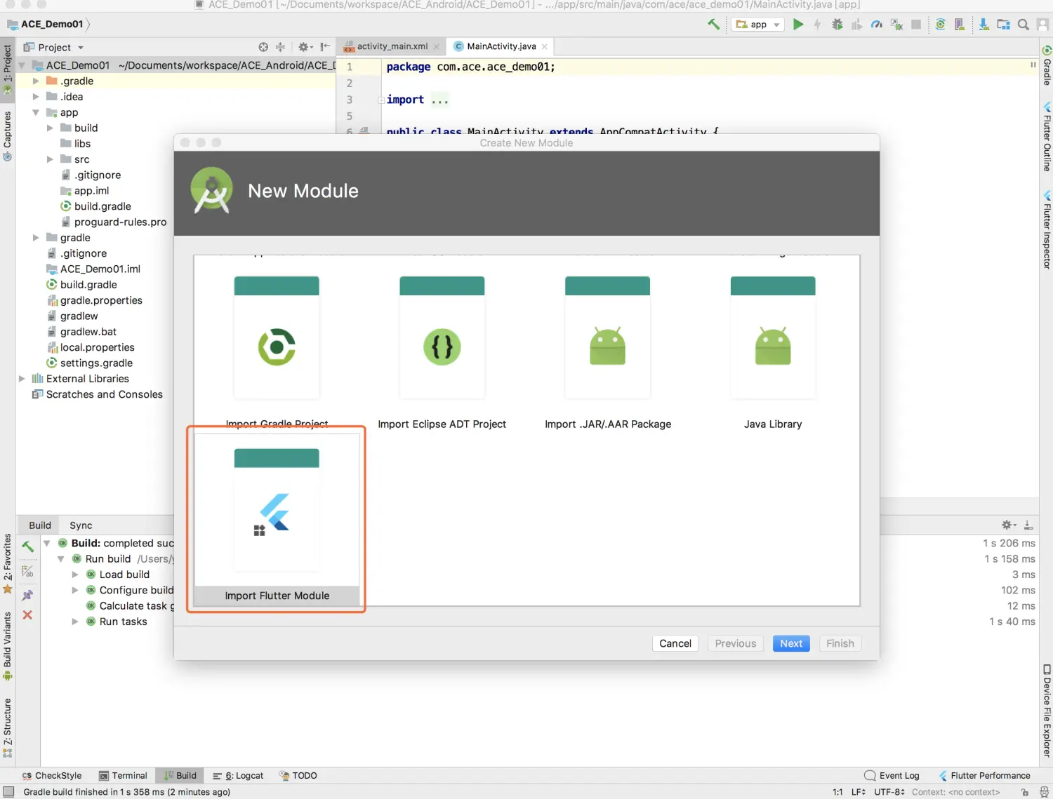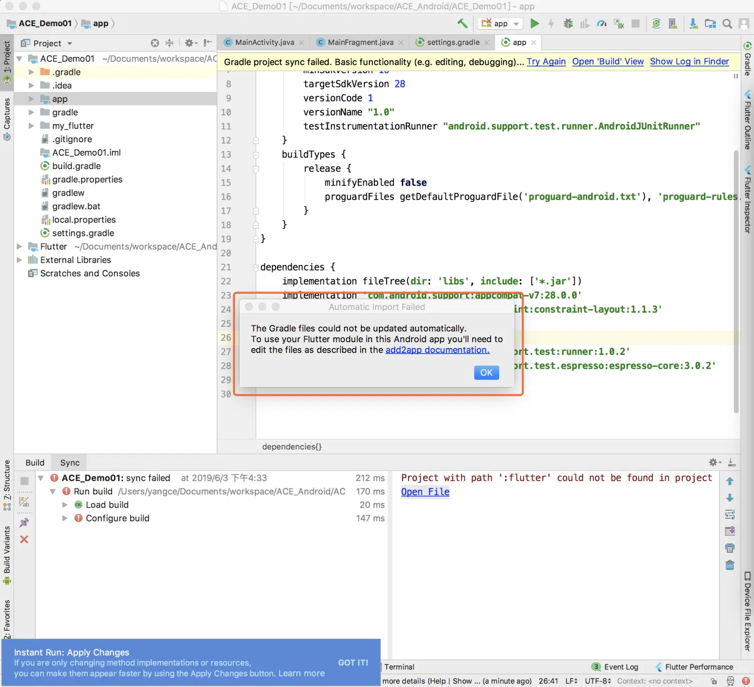 可采用 Flie -> Sync Project with Grdle Files 时,可通过 Import Flutter Module 方式引入;此时若报 The Gradle files could not be updated automatically 则需要手动 3.1 操作;