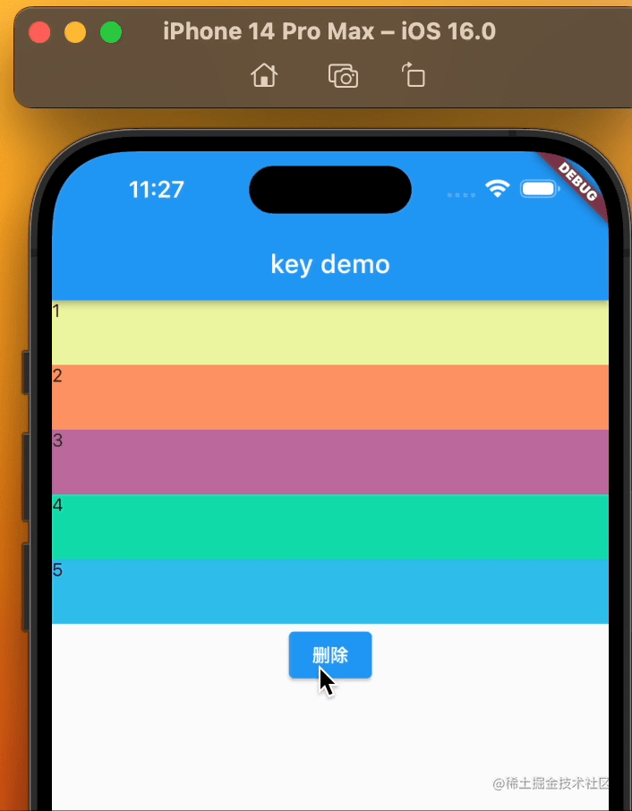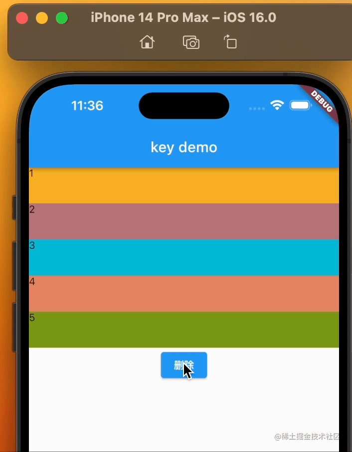 点击删除按钮,可以看到颜色错乱的现象消失了,一切正常。那么有没有想过,为什么ColorBlock有key和没key会出现这种差异?