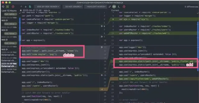 打开 app.js文件,删除delete标记部分,添加add标记部分: