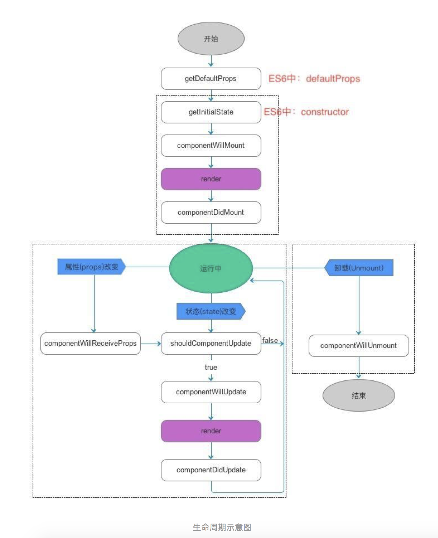 上张图涵盖了一个组件从创建、运行到销毁的整个过程。大家可以看到,初始化的时候会调用5个函数(按先后顺序)。这5个函数在整个组件被创建到销毁的过程中只调用一次。初始化完毕后,当组件的props或者state改变都会触发不同的钩子函数,继而引发组件的重新渲染。现在我们把这过程拆开一点一点来分析。