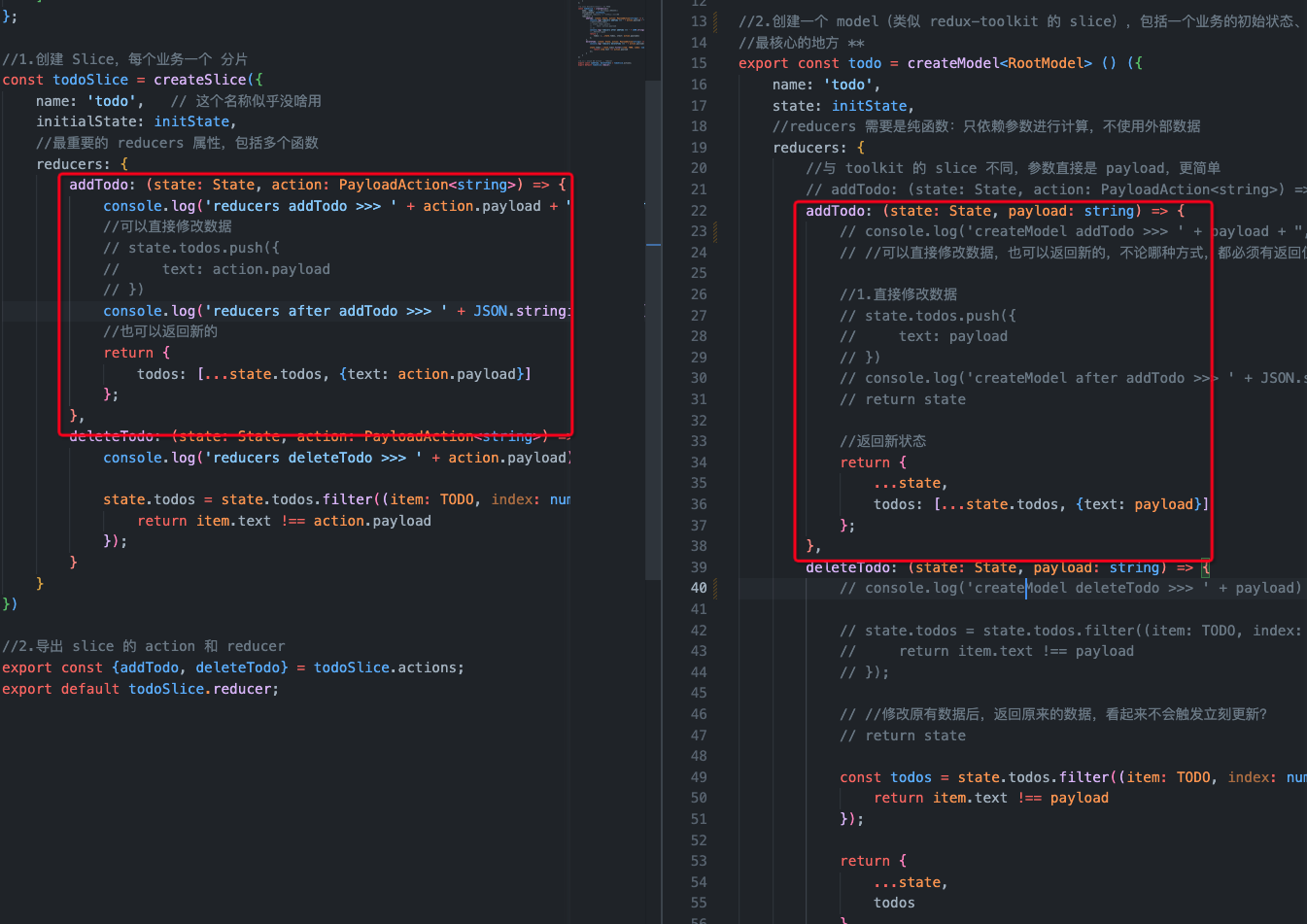 在分发行为的时候,toolkit 是这样:dispatch(addTodo(text)),rematch 是这样:dispatch.todo.addTodo(text) ,个人感觉 rematch 这种略微好一点,避免了层层嵌套。