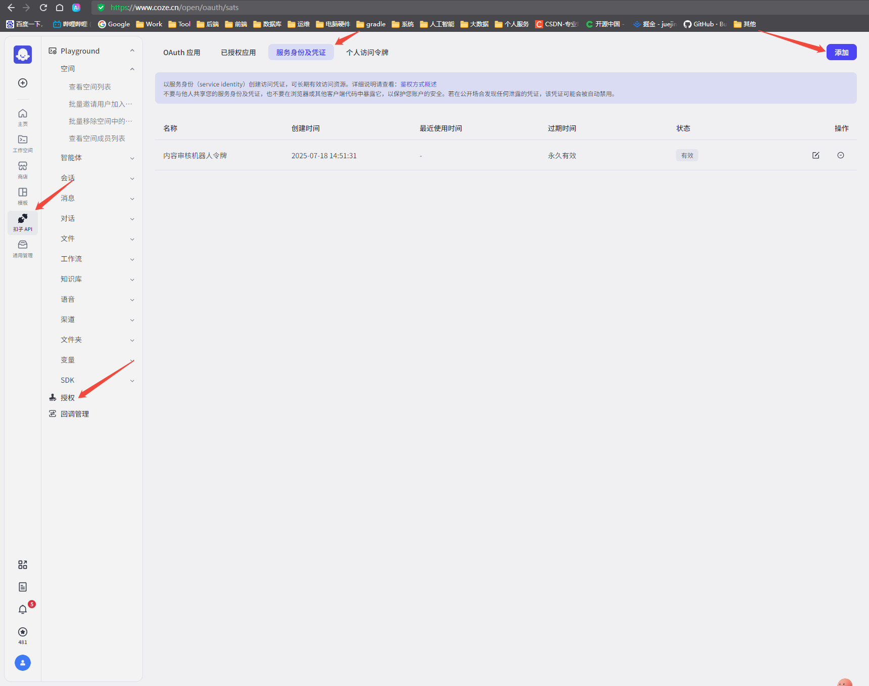 进入扣子的控制台,找到扣子API,点击授权,在服务身份及凭证处创建一个令牌,不建议使用个人访问令牌,因为一个月就过期了,没人想每个月都更新一遍令牌吧。