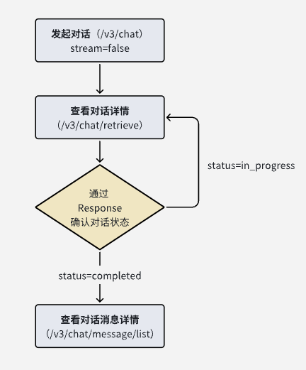 其中conversationId和chatId能在上一个chat接口的返回值中拿到,用于查询这里的状态,主要就是判断返回值中的status是否为completed,如果是progress状态则需要再次请求,我这里偷懒直接使用递归调用了,限制调用10次,超出次数则直接报错,不再执行。