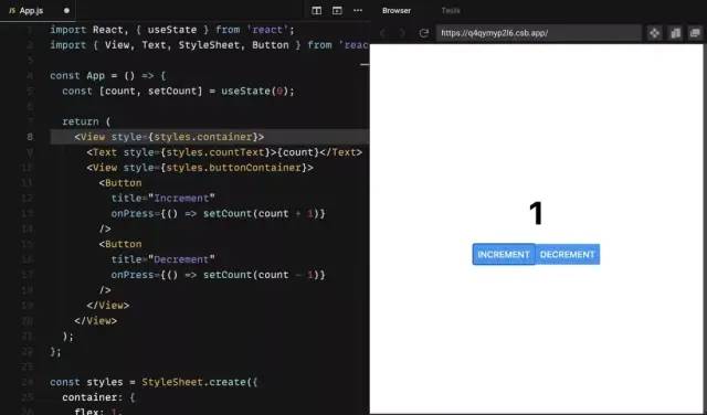 该代码从 "react "和 "react-native "库中导入了必要的模块。我们使用useState创建了一个状态变量count和它相应的setter函数。
